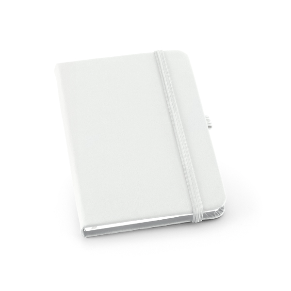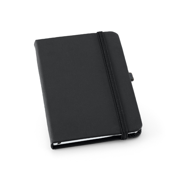Caderno A6 capa dura. C. sintético. Com porta esferográfica e 80 folhas pautadas. 90 x 140 mm