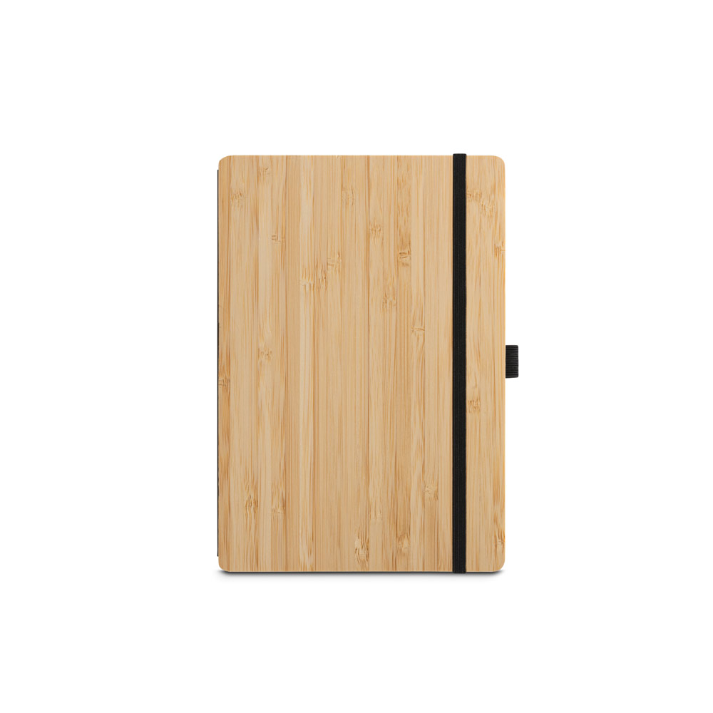 Conjunto de caderno A5 e esferográfica em bambu. O caderno de capa e contracapa em placa de bambu e lombada em poliéster 100% reciclado (100% rPET). Interior contém 96 folhas pautadas com papel reciclado. Suporte para esferográfica (inclusa) e elástico para fecho do caderno. Esferográfica em bambu e escrita em preto. Fornecido em caixa presente de oferta de papel kraft reciclado. A cor e o resultado da impressão nos materiais naturais pode variar entre produtos. Caderno: 140 x 210 mm | Esferográfica: ø11 x 138 mm | Caixa de oferta: 160 x 255 x 18 mm