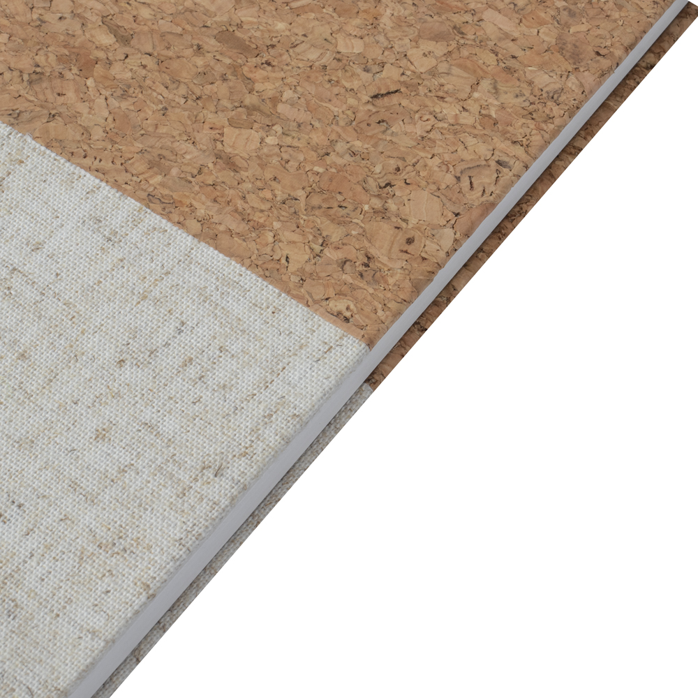 O caderno de anotações é feito de cortiça com detalhe em algodão cru, em capa dura com miolo 80 folhas pautadas.