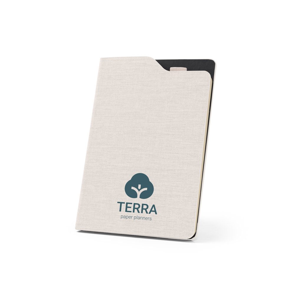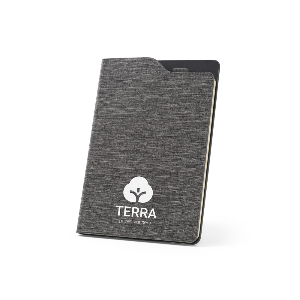home / produtos / Escritório / Caderno / LOBATO. Caderno A5 de capa dura em tecido poliéster 100% reciclado (100% rPET) com folhas pautadas - C293586