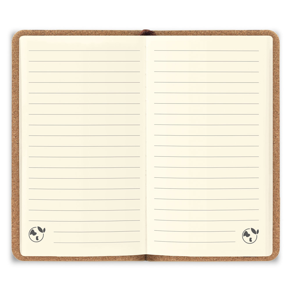 Caderno de bolso de capa dura em folha de bambu e cortiça. Contém 160 páginas, em papel 100% reciclado, pautadas cor de marfim, fita separadora, suporte para esferográfica (não inclusa) e elástico para fecho do caderno. 90 x 142 mm