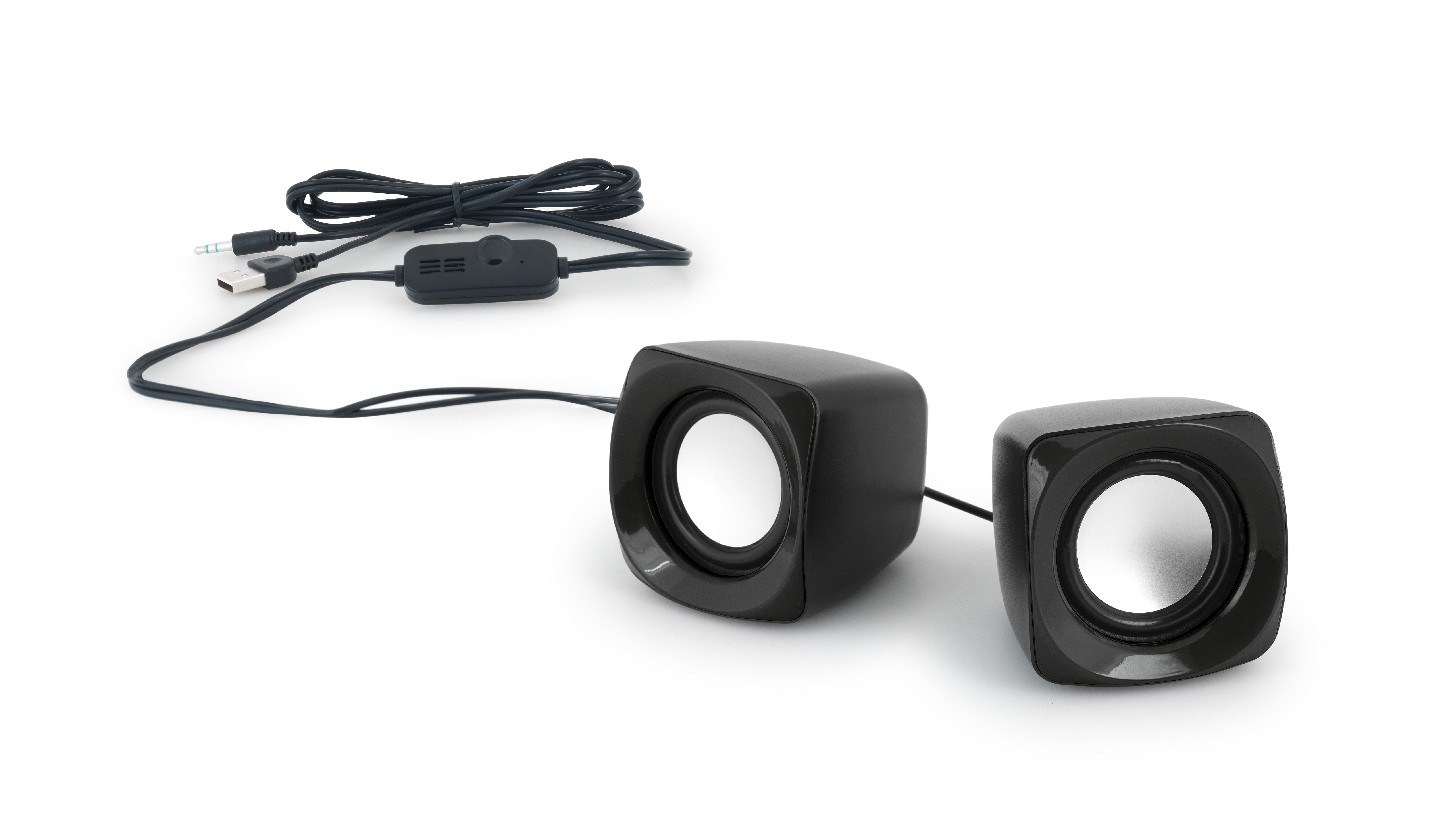 Caixa de som. ABS. Com ligação stereo 3,5 mm, ligação USB e controle de volume. Com 3W/4Ω. 65 x 65 x 65 mm