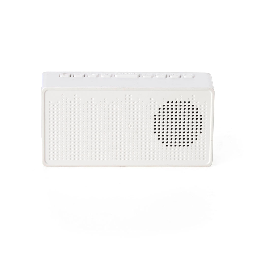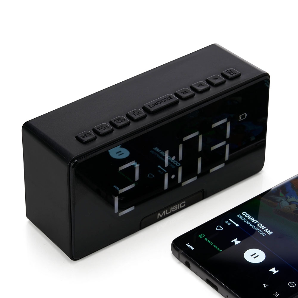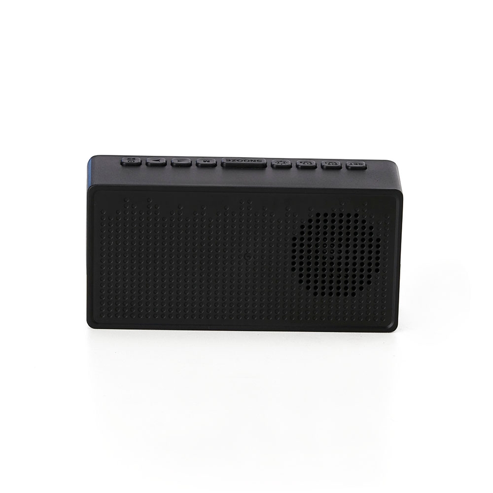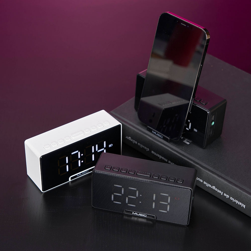 Caixa de som multimídia com relógio despertador e suporte para celular. Produzida em plástico e com borrachas antiderrapantes na área inferior, a caixa de som tem a área frontal com display de LED, além de um compartimento com suporte para celular – uma espécie de “gaveta” aonde é exibido (MUSIC), basta puxá-la ter acesso ao compartimento. A caixa de som executa nos modos bluetooth, rádio FM, cartão TF-microSD e entrada auxiliar P2. Acompanha cabo USB e manual em inglês.