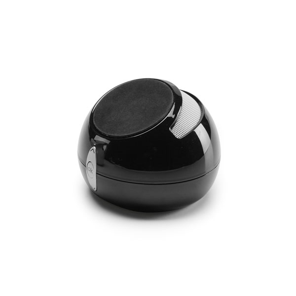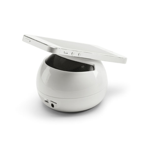 Caixa de som com microfone. em ABS, com transmissão por bluetooth, ligação stereo 3,5 mm e leitor de cartões TF, com 3W/4Ω e autonomia até 3 h. Função para atender chamadas, controle de volume e conexão à playlist do dispositivo móvel. Com apoio antideslizante para celular. Incluso cabo USB para carregar. Fornecida em caixa presente. ø85 x 66 mm | Caixa: 93 x 93 x 85 mm