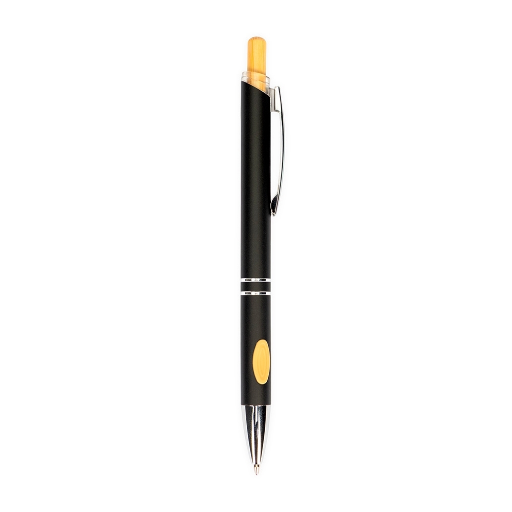 Descrição: Caneta metálica com detalhes emborrachados no corpo, acionamento por clique com parte superior em bambu, carga esferográfica azul de 1.0mm, o que proporciona uma pegada leve e uma escrita precisa.
