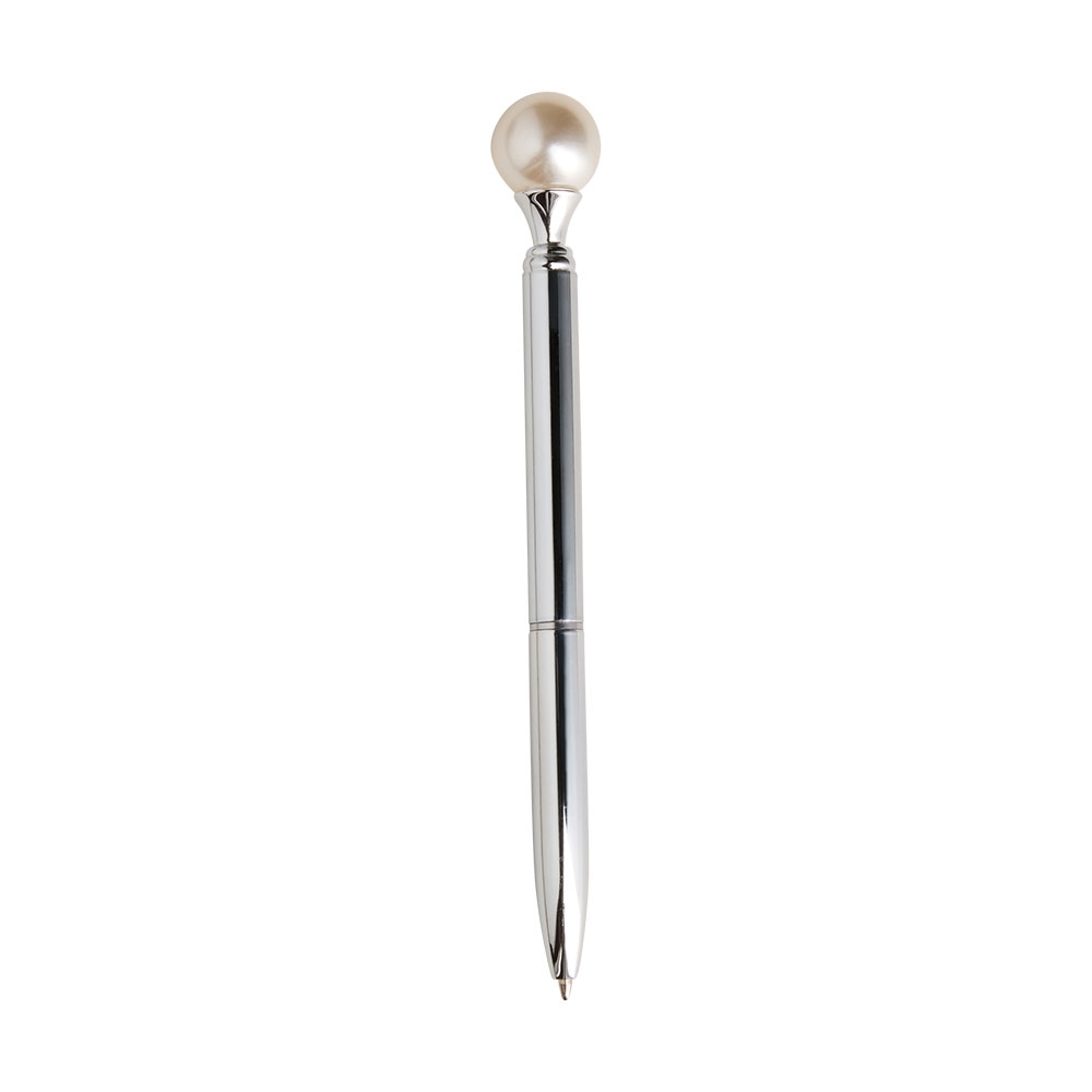 Descrição: Caneta em metal com detalhe ornamental no formato de pérola. Possui acionamento em clique, destravamento ao pressionar a parte inferior do clipe e carga esferográfica azul de 1.0mm.