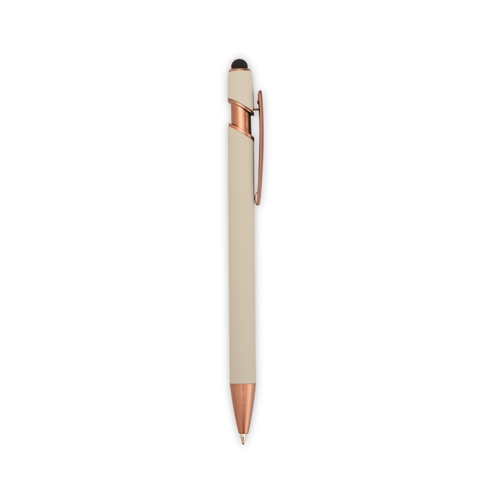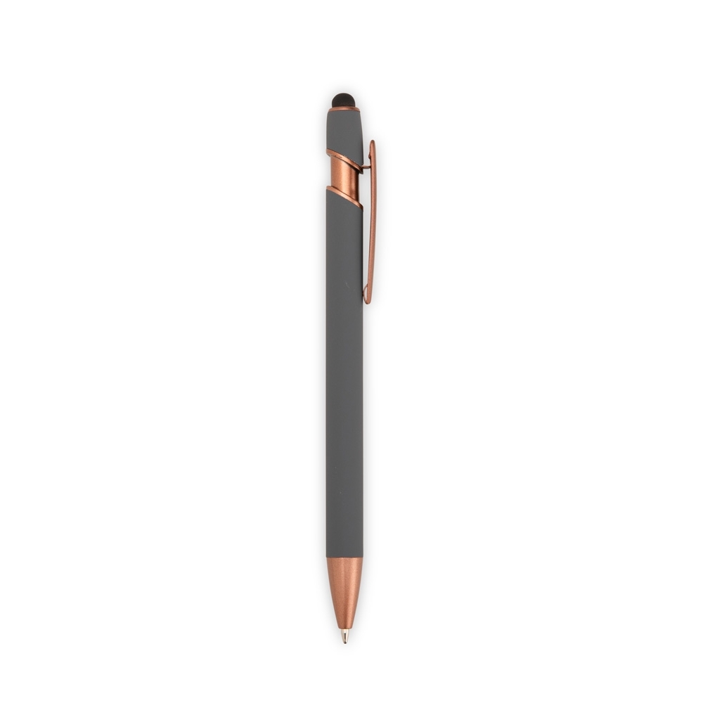 Descrição: Caneta metálica com pintura de acabamento emborrachado e acionamento por clique. Conta com topo emborrachado para uso em dispositivos com telas sensíveis ao toque, além de carga esferográfica azul de 1,0 mm.