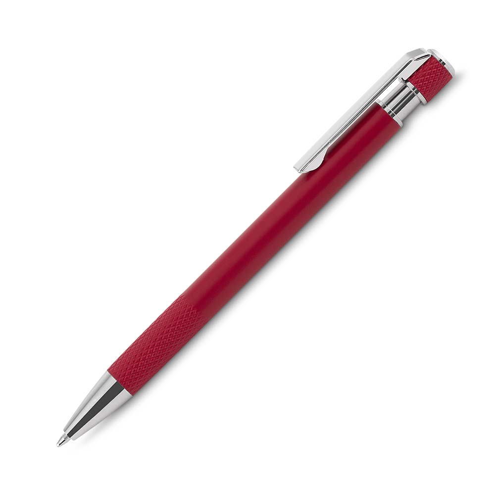 Caneta esferográfica com corpo em alumínio reciclado, acionador e clipe cromado, escrita em tinta azul. Refil substituível tipo Parker.