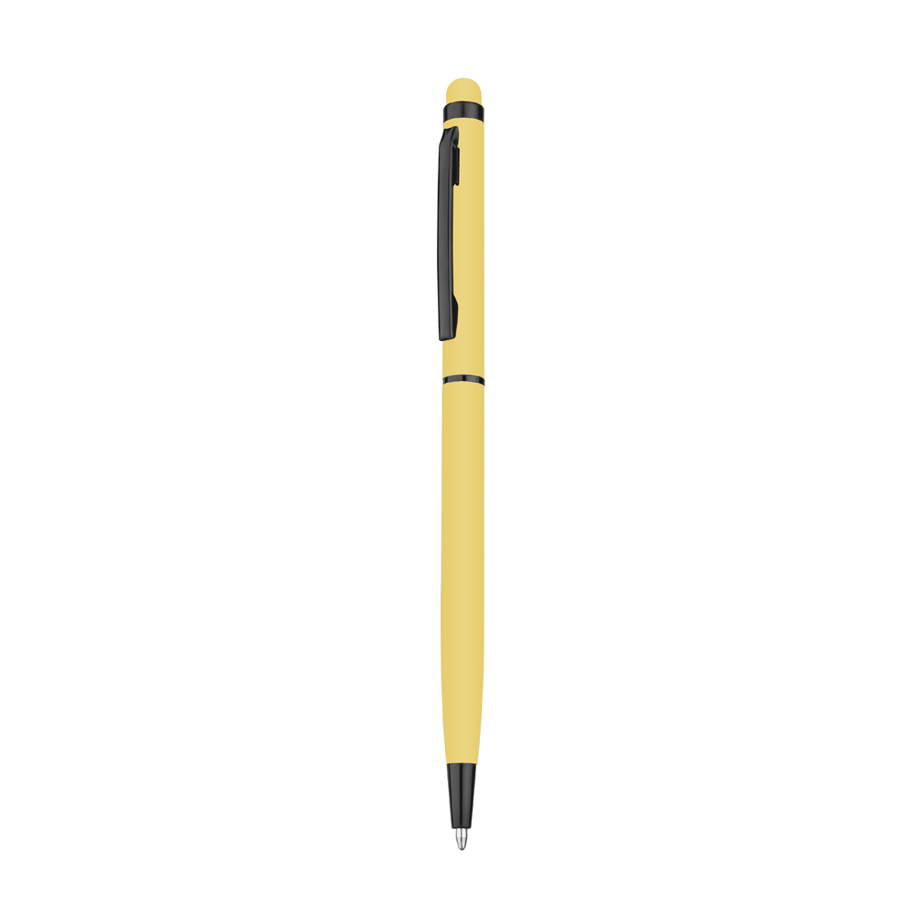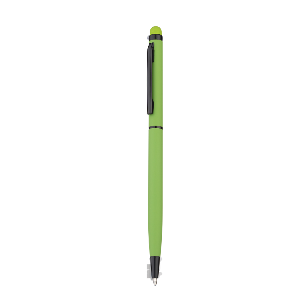 Caneta esferográfica de metal com escrita em azul, com ponta touch com corpo emborrachado. Detalhe preto.