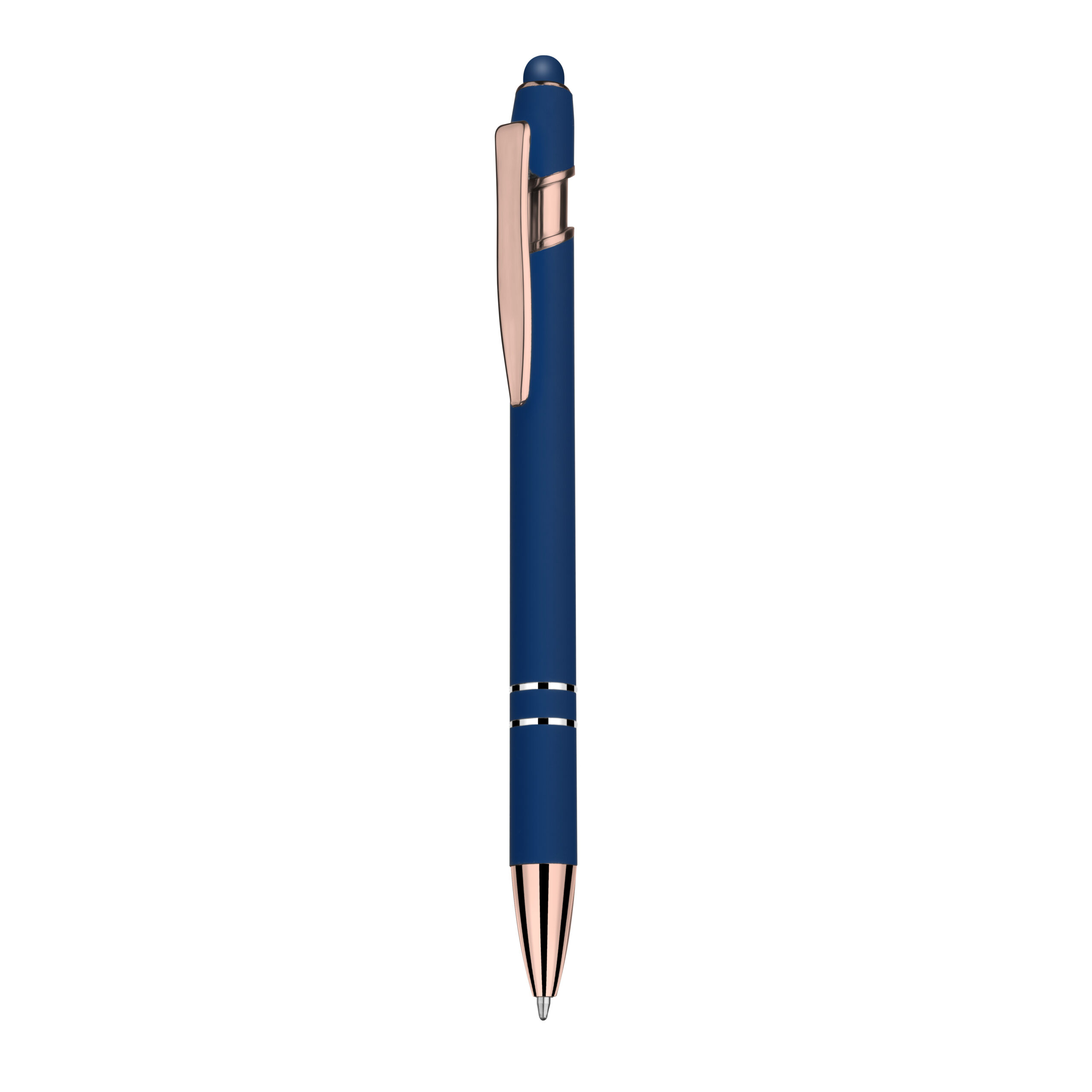 Caneta esferográfica em metal escrita em azul com cor fosca. Refil tipo parker com ponta touch emborrachada e detalhe dourado.