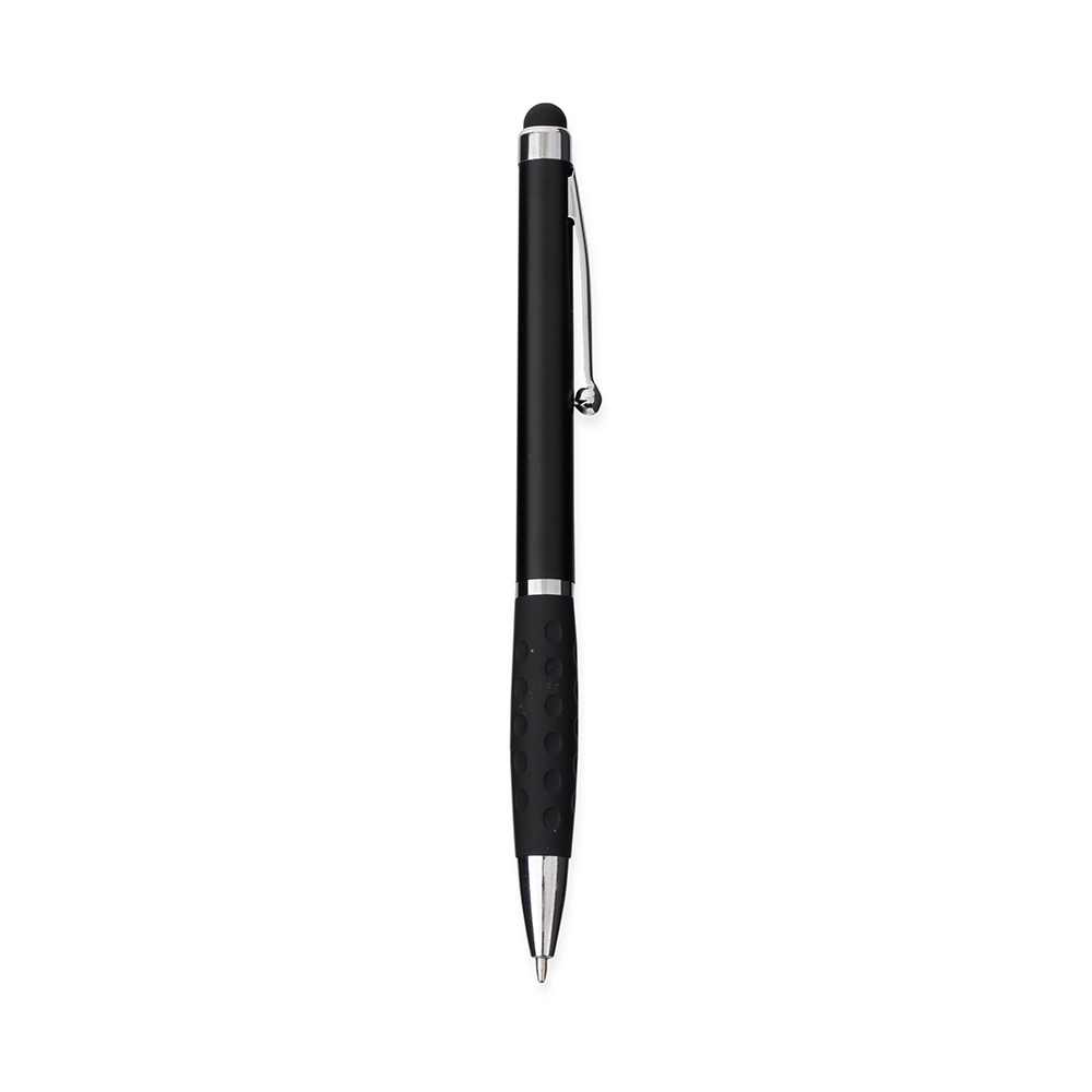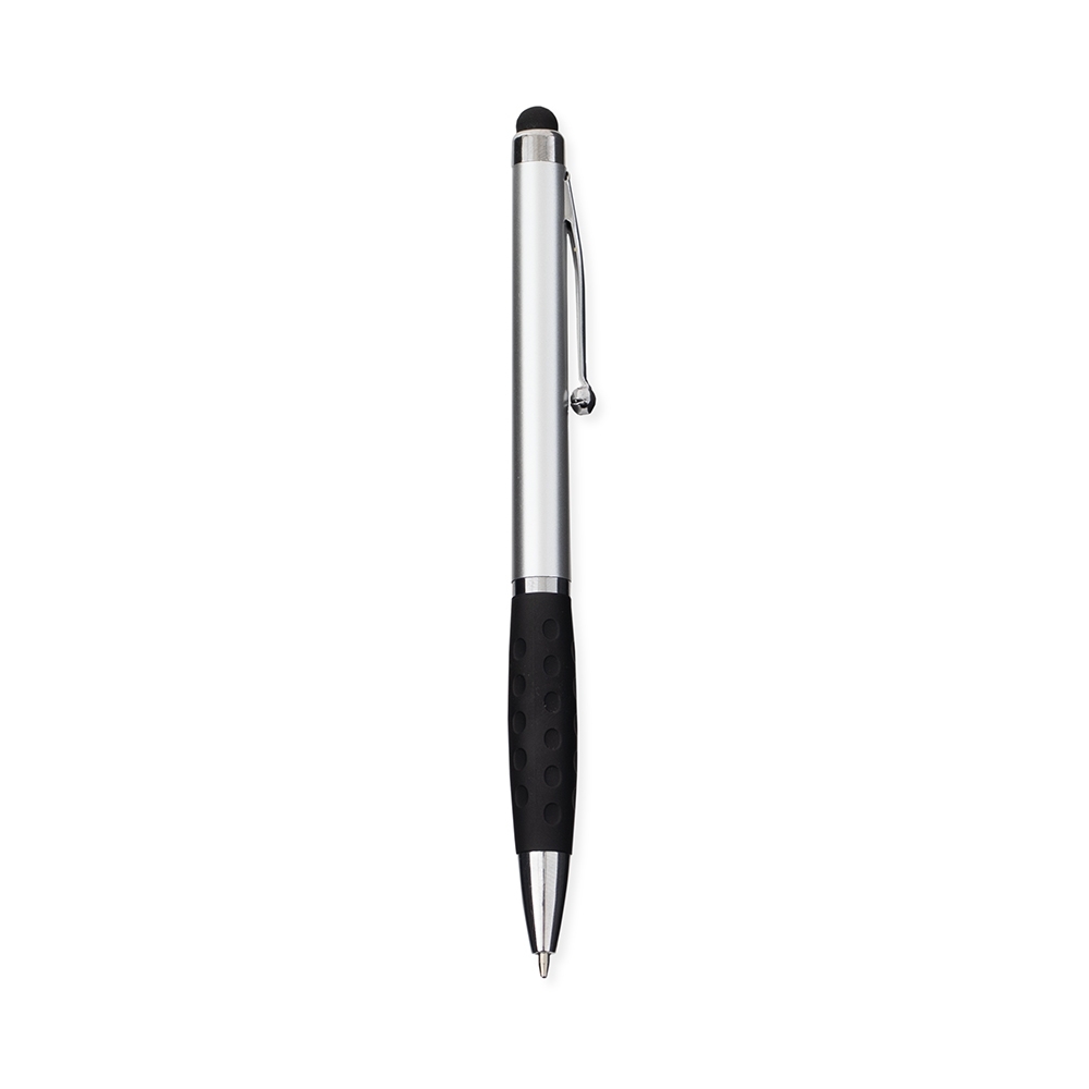 Descrição: Caneta plástica com ponta, clip e pequenos detalhes em metal, além de detalhes ergonômicos na área próxima à tampa. Possui acionamento por rotação, carga esferográfica azul de 1.0mm e ponteira emborrachada para interação com dispositivos de telas sensíveis ao toque.