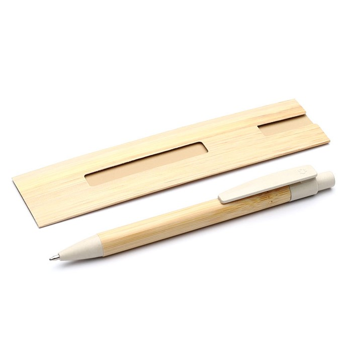 Caneta corpo de bambu com detalhes em plástico. Acompanha estojo de papel bambu print. (14662)