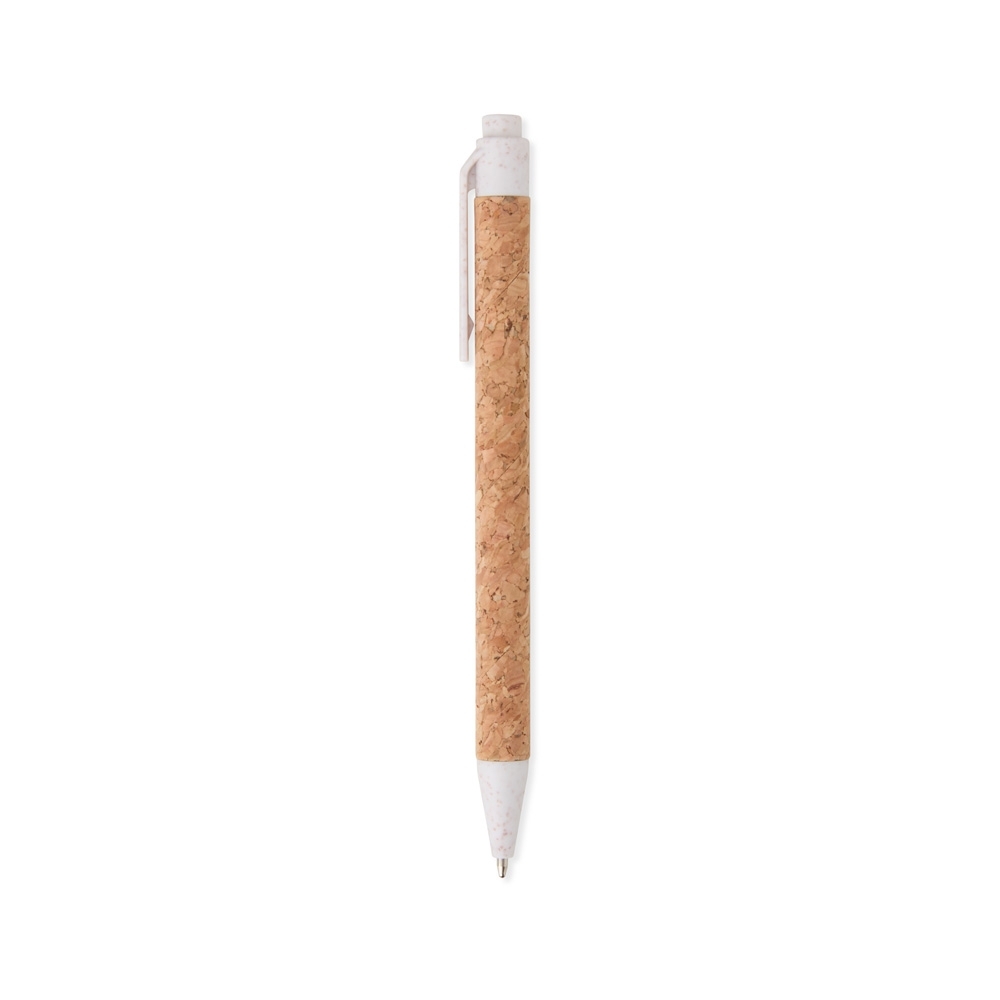 Descrição: Caneta de cortiça com detalhes em palha de trigo, carga esferográfica azul 1.0mm e acionamento por clique.