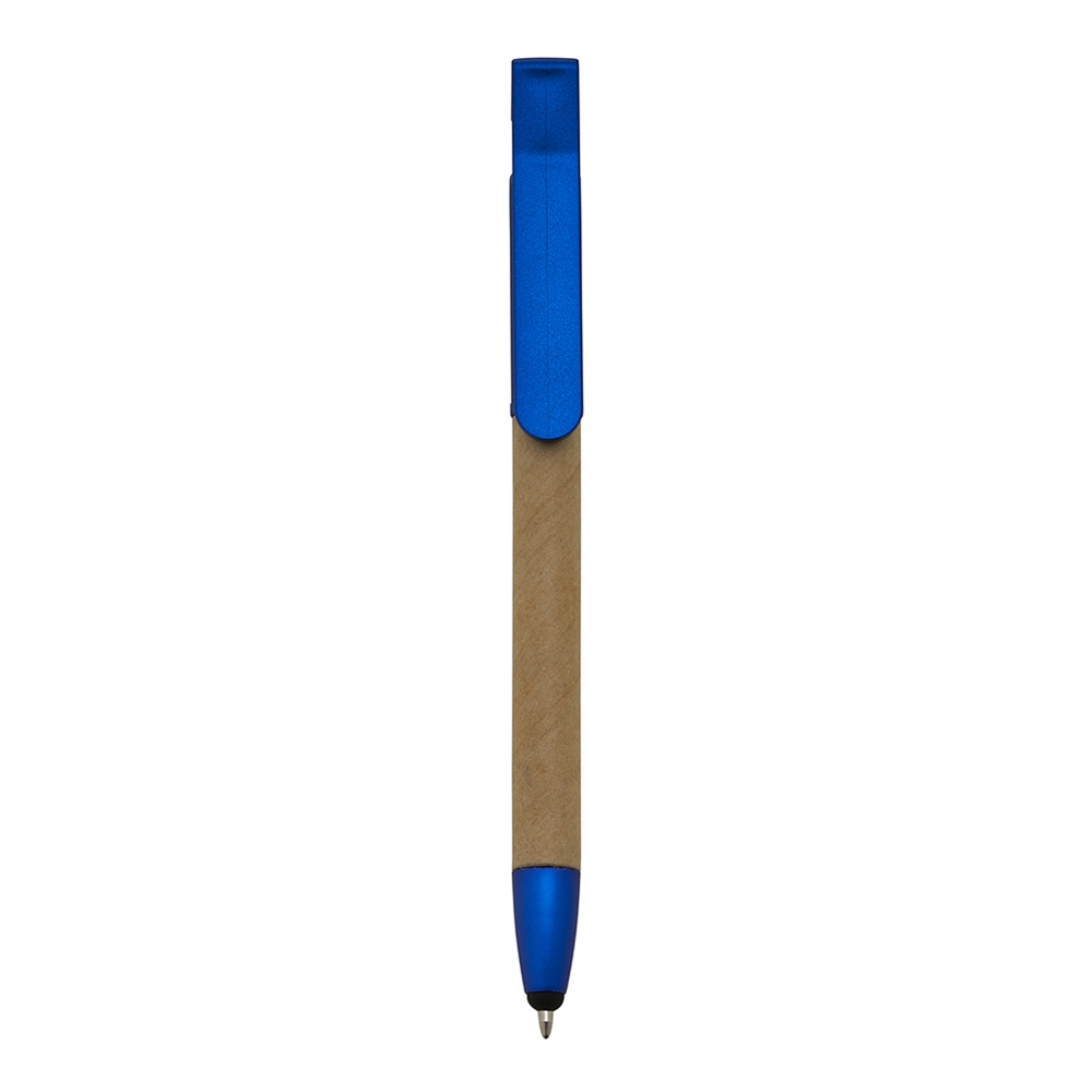Caneta ecológica touch com suporte para celular, corpo de papelão e detalhes em plástico. Clip aberto utilizado como suporte para o celular e parte superior com limpador de tela. Aciona por giro, carga esferográfica na cor azul.