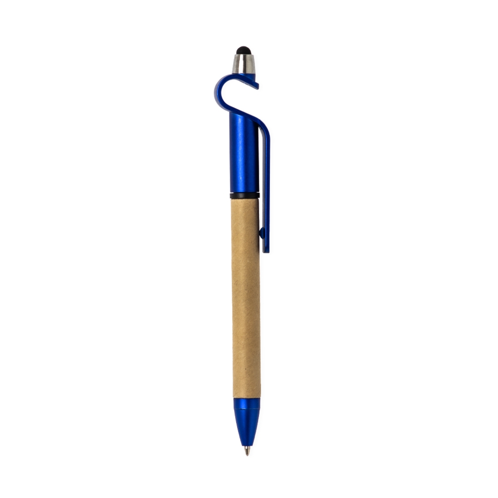 Descrição: Caneta de papelão com detalhes plásticos, contém suporte para celular e touch screen. Carga esferográfica azul e acionamento por rotação.