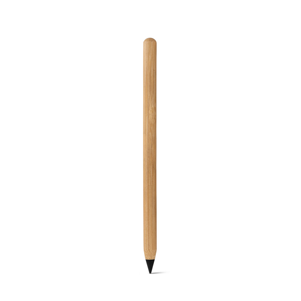Caneta sem tinta com ponta de liga metálica com grafite e corpo em bambu. Apto para um uso prolongado. Até 2 km de escrita. Não é necessário apontar e a escrita pode ser apagada. Produto amigo do ambiente. Ø8 x 138 mm