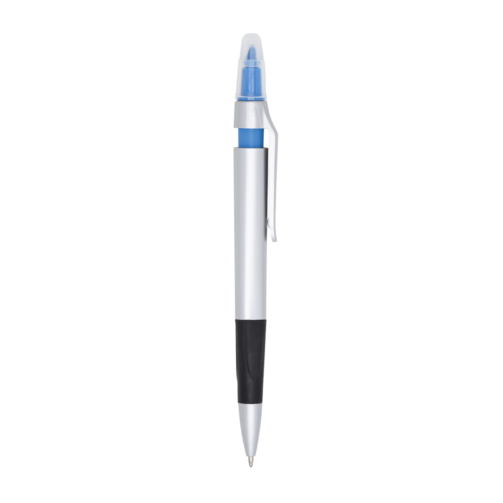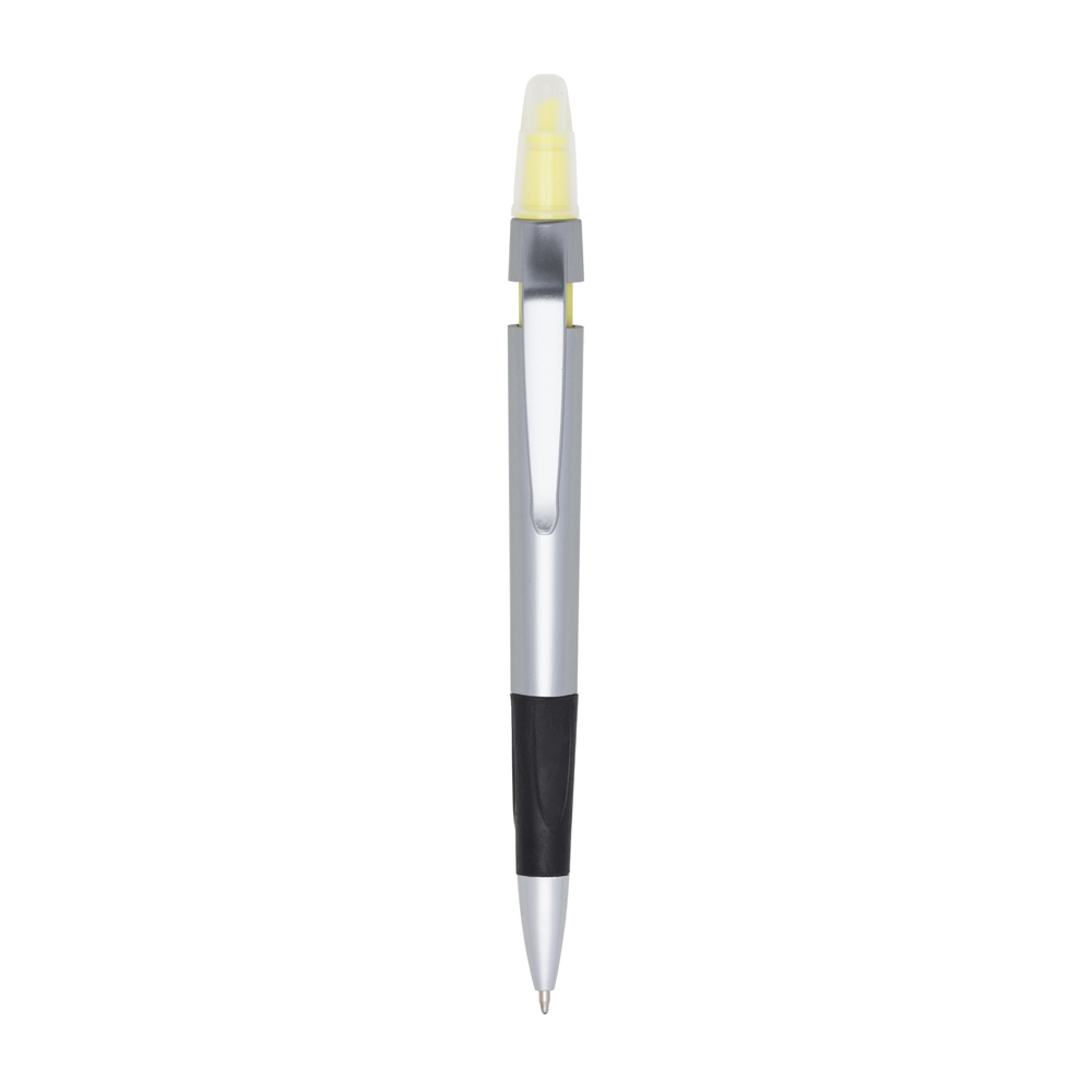 Caneta plástica esferográfica e marca texto com corpo prata. Possui tampa protetora no marca texto e detalhe emborrachado com relevo na parte inferior. Aciona por clique. Tamanho 14,8 cm x 1,7 cm.