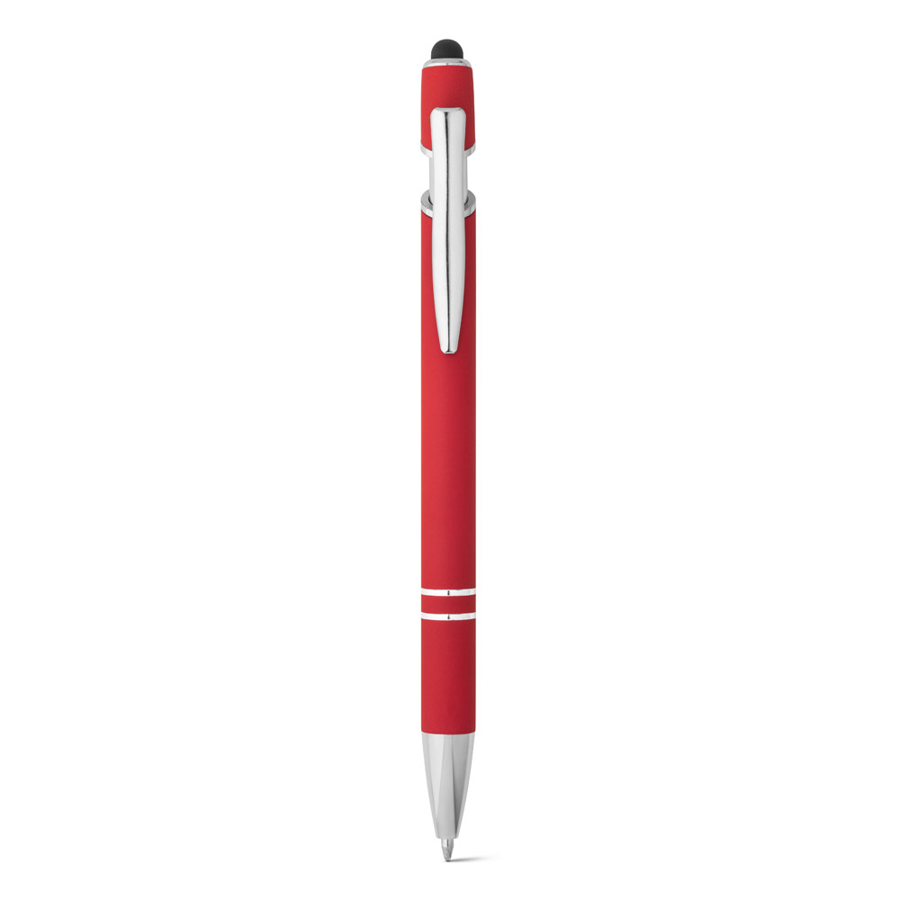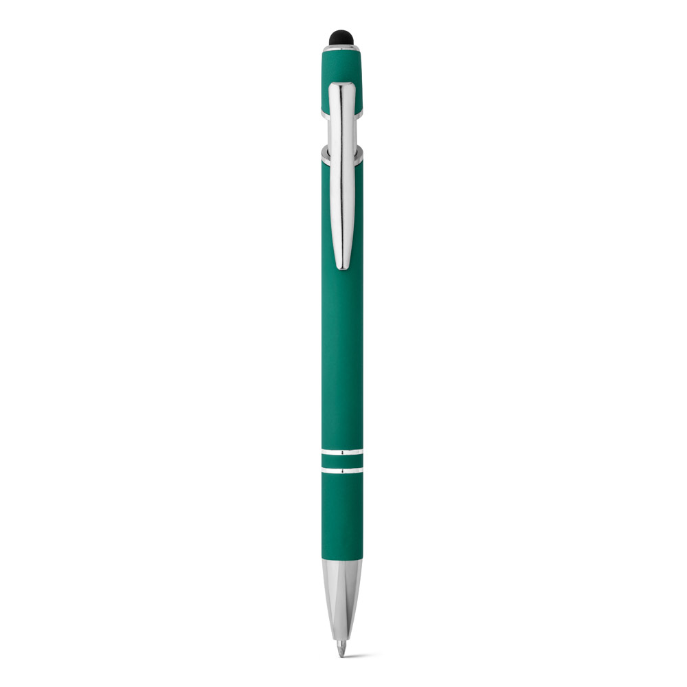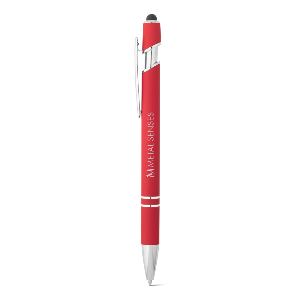 Esferográfica em alumínio com acabamento emborrachado. A esferográfica tem escrita em azul, ponteira touch no topo da esferográfica e clipe de metal. ø10 x 143 mm