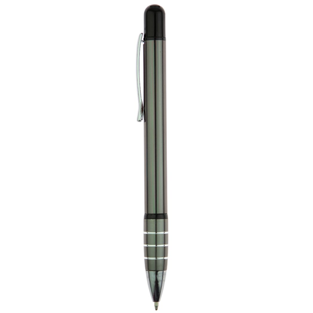 Caneta de metal acionada por giro, possui 3 anéis pratas. Tamanho 14,3 cm.