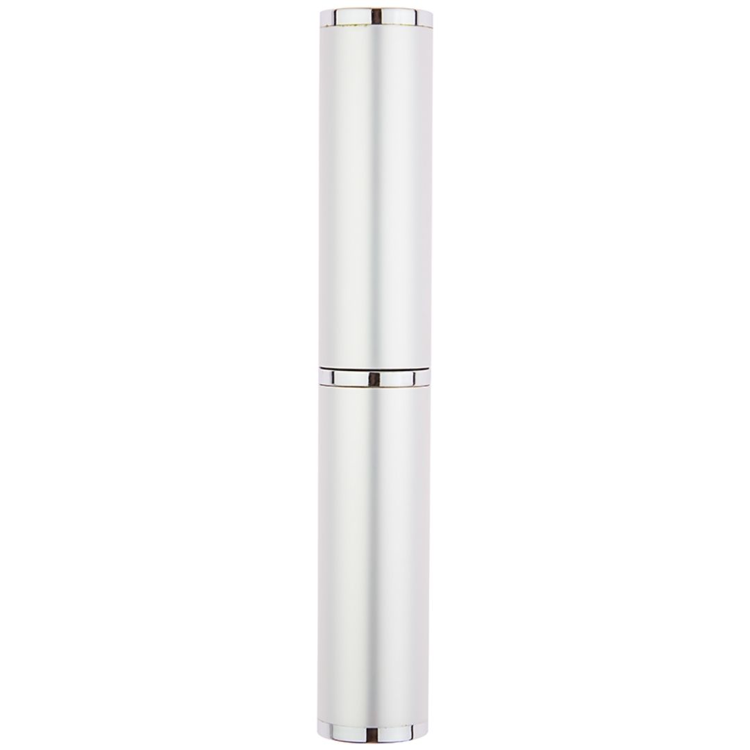 Caneta de metal com estojo tubo de alumínio. Obs: contém espuma no interior do tubo. Medida do tubo: 14,9cm x 2,2cm. Tamanho 13,6 cm.