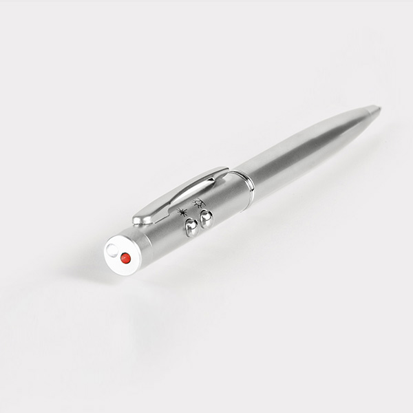 Caneta Ebre esferográfica metálica com escrita em azul. Metal. Com ponteira laser e LED. Incluso 3 pilhas LR41. 1,5km de escrita. Em estojo. ø10 x 131 mm | Estojo: 170 x 50 x 20 mm