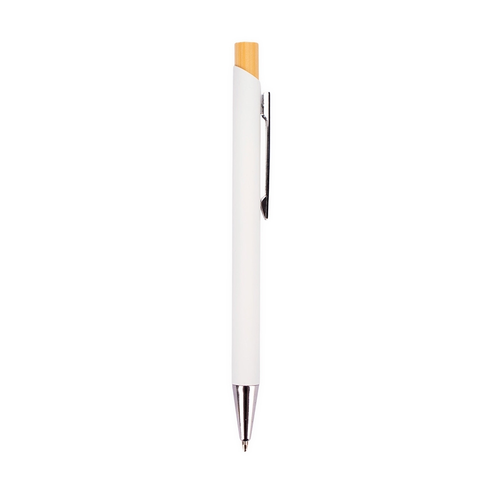 Descrição: Caneta esferográfica com carga azul de 1.0mm. Possui construção metálica e acionamento por clique em bambu, o que proporciona uma pegada leve e maior precisão durante o uso.