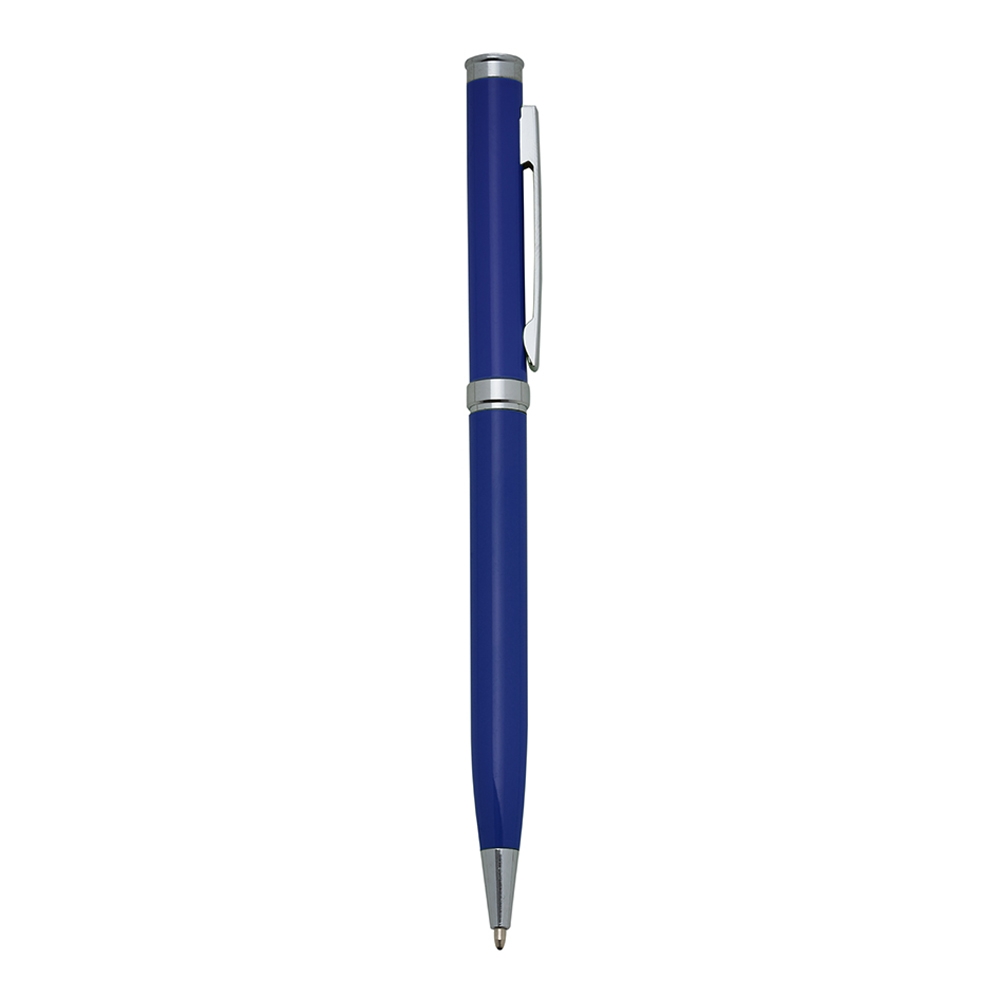 Caneta semimetal com pintura brilhante colorida e detalhes em prata. Clip metálico, acionamento por giro e carga esferográfica azul.