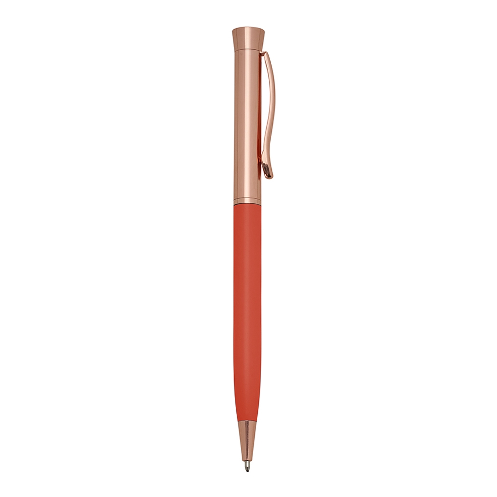 Caneta semimetal com pintura brilhante colorida e detalhes em bronze. Clip metálico, acionamento por giro e carga esferográfica azul.