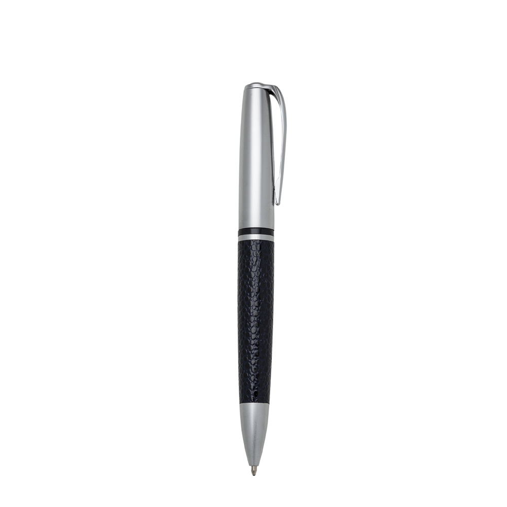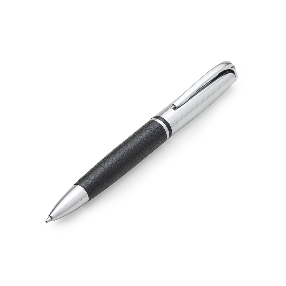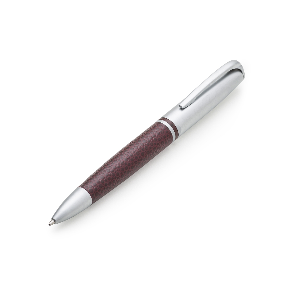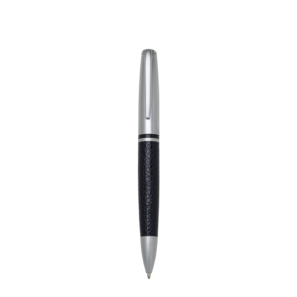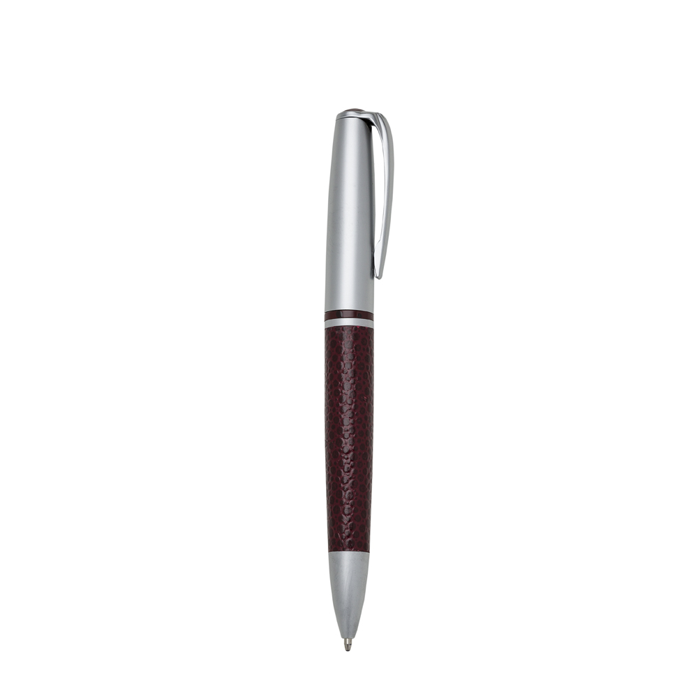 Caneta metal prata com detalhe em couro. Clip metal com a ponta colorida, possui anel central preto e dois anéis em relevo na ponteira. Possui as versões fosca e brilhante, aciona por giro. Tamanho: 13,1 cm x 1,6 cm.