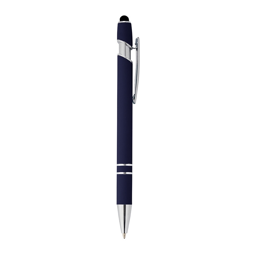 Descrição: Caneta metálica touchscreen com acabamento similar à borracha, acionamento por clique e carga esferográfica azul 1.0mm.