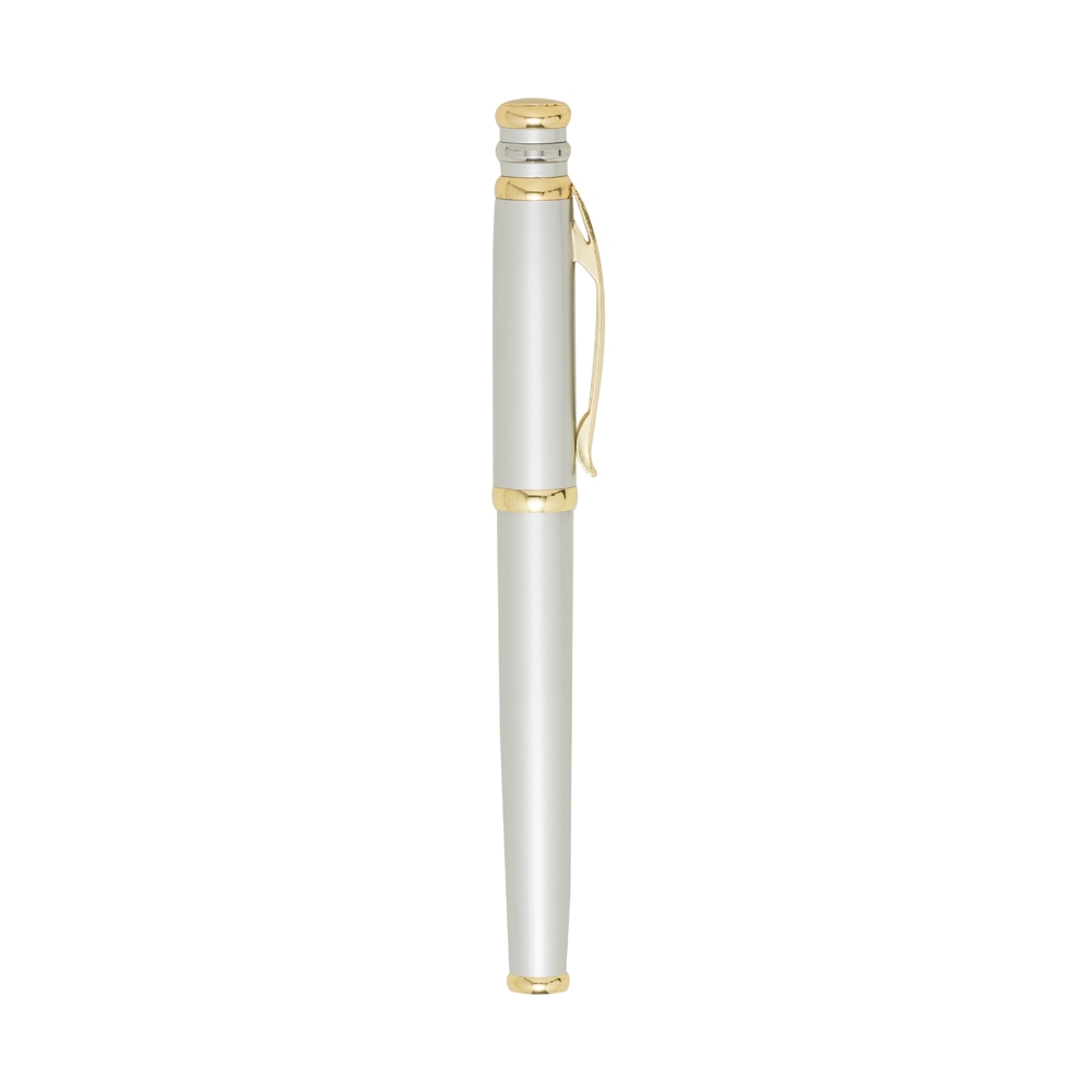 Caneta metal roller com tampa e veludo. Clip metal dourado com 3 anéis, sendo dois dourados e o central prata. Possui anel no centro e detalhe inferior também dourado. Tamanho : Caneta 14,2 cm x 1,7 cm – Veludo 15,8 cm x 2,9 cm