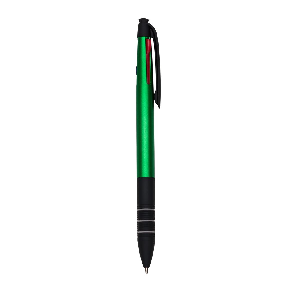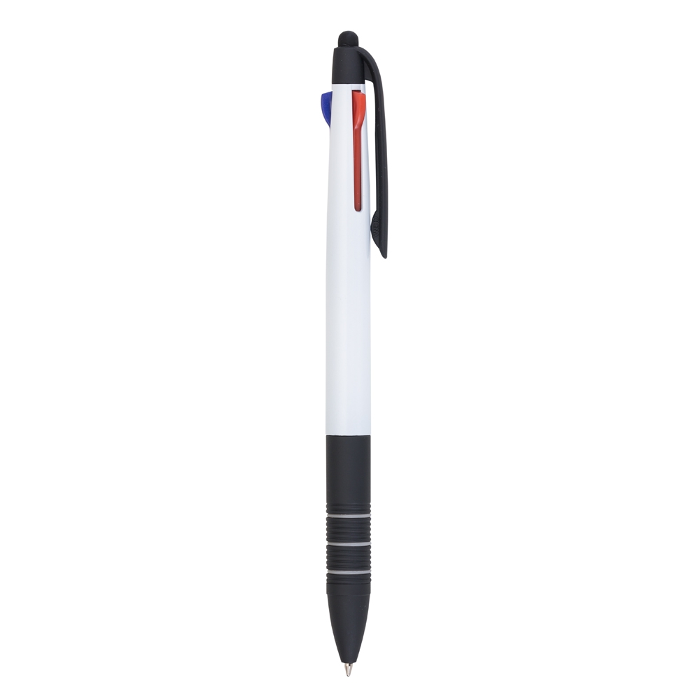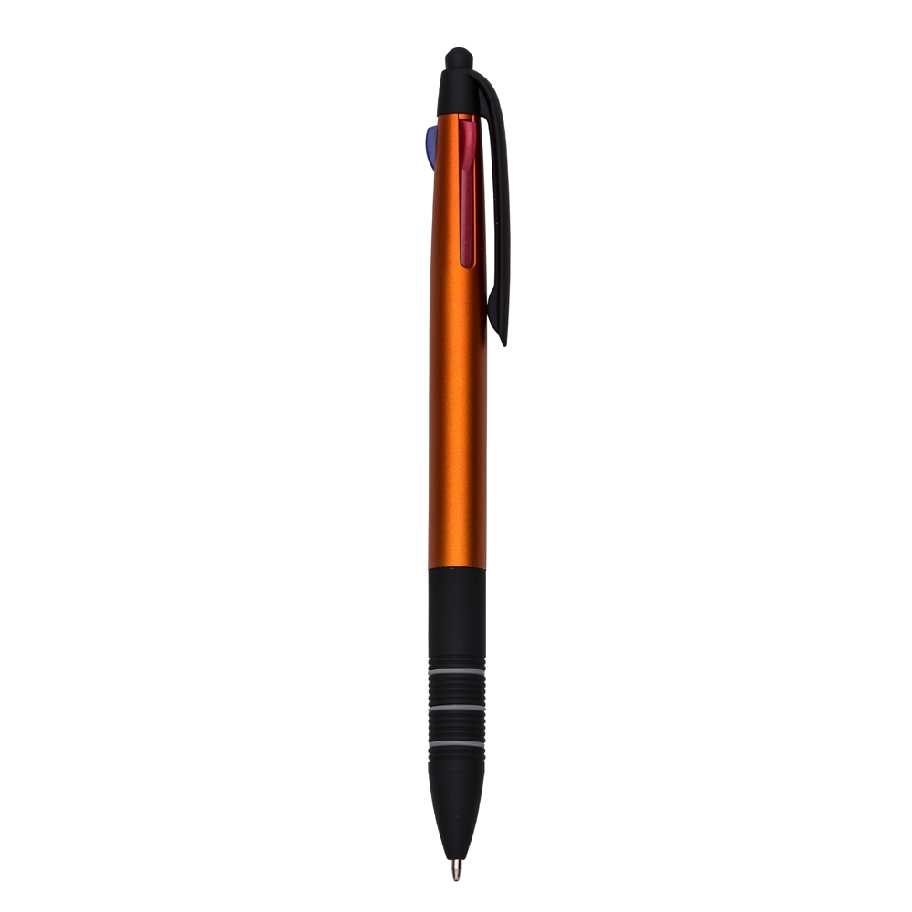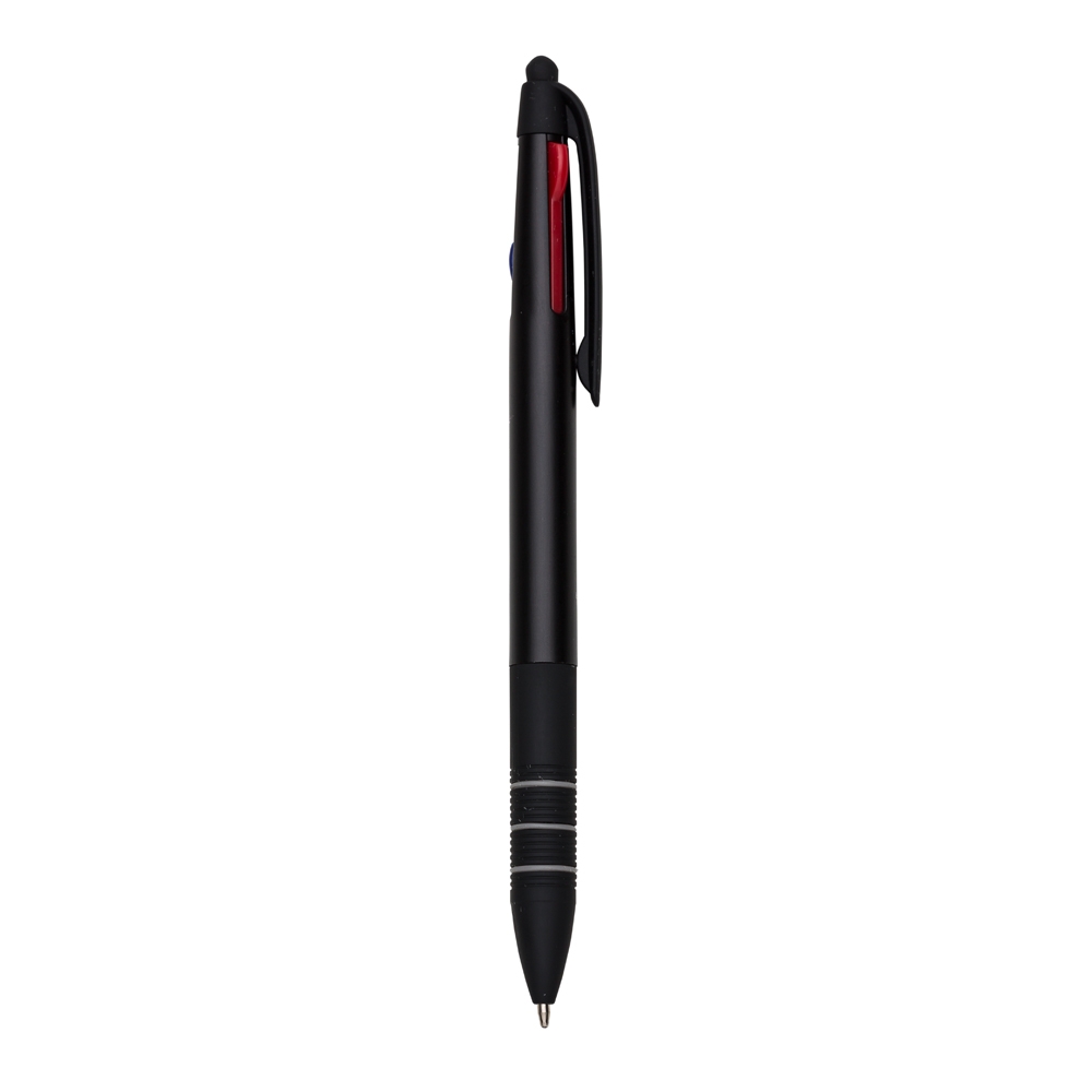 Caneta plástica três cores e ponteira touch, corpo colorido com detalhes emborrachados. Possui as cargas azul, preto e vermelho(basta descer o suporte colorido pra acionar a cor). Clip emborrachado e touch superior, possui três anéis cinzas na parte inferior. Tamanho 14,7 cm x 1,3 cm.
