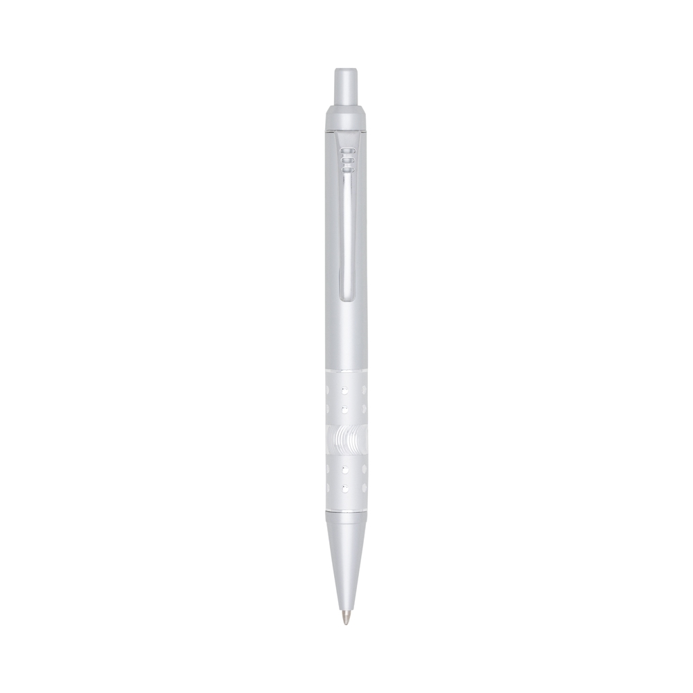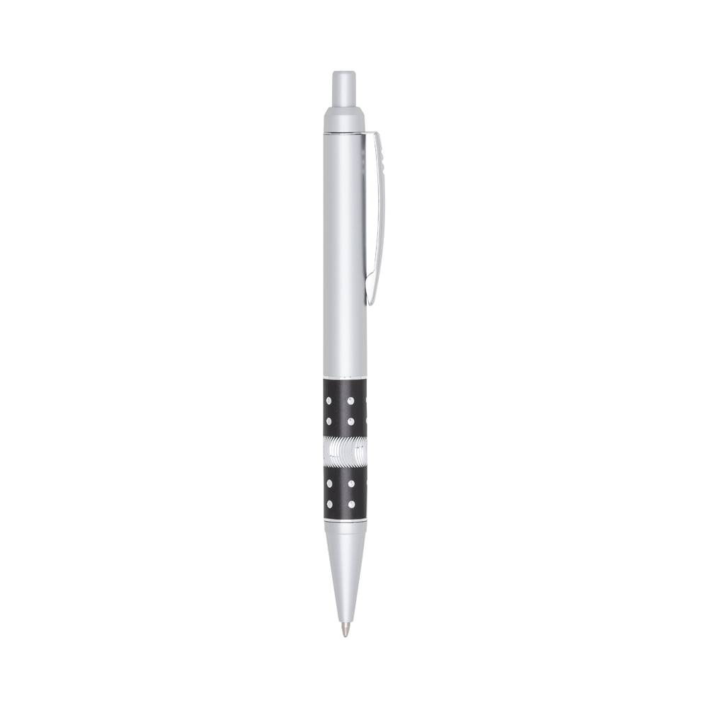 Caneta plástica inteira prata com detalhes inferiores coloridos. Possui clip de metal com 3 cortes superiores, vinte e oito pedras strass com anel em relevo no centro. Aciona por clique.