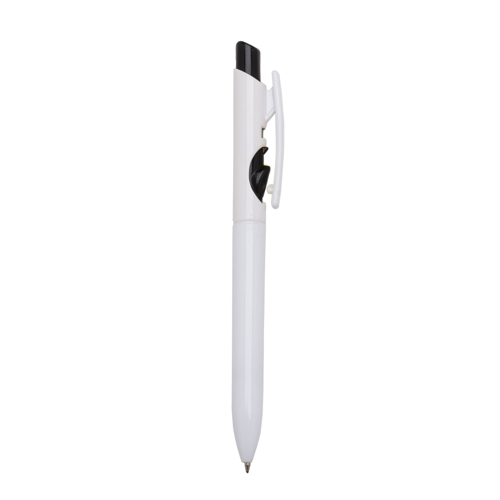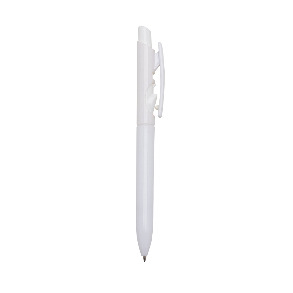 Caneta plástica branca com detalhes no acionador e destravador colorido. Aciona por clique e para destravar basta apertar a parte inferior do clip.