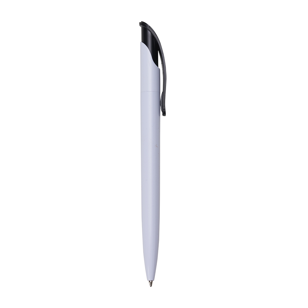 Caneta plástica branca com clip colorido. Aciona por clique.