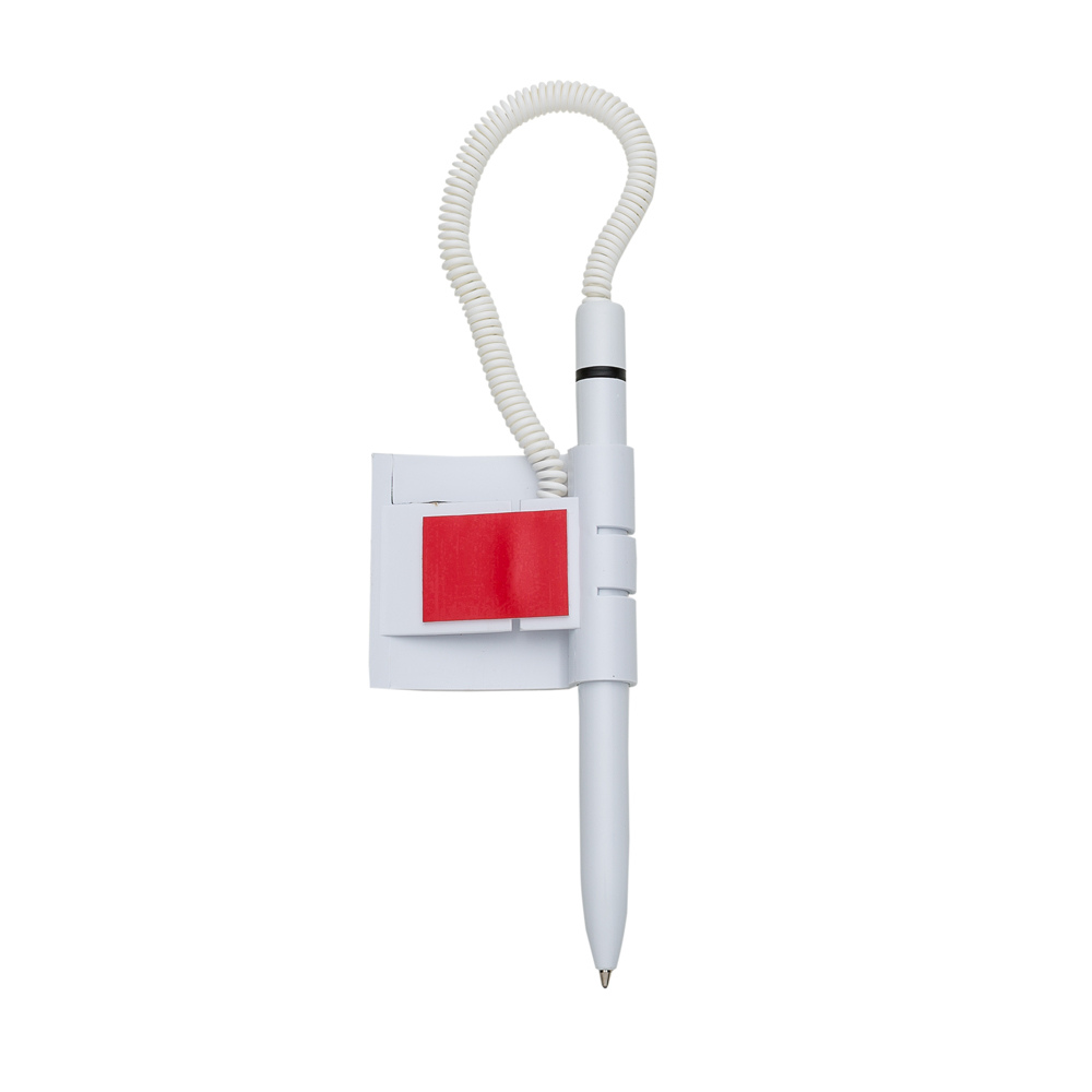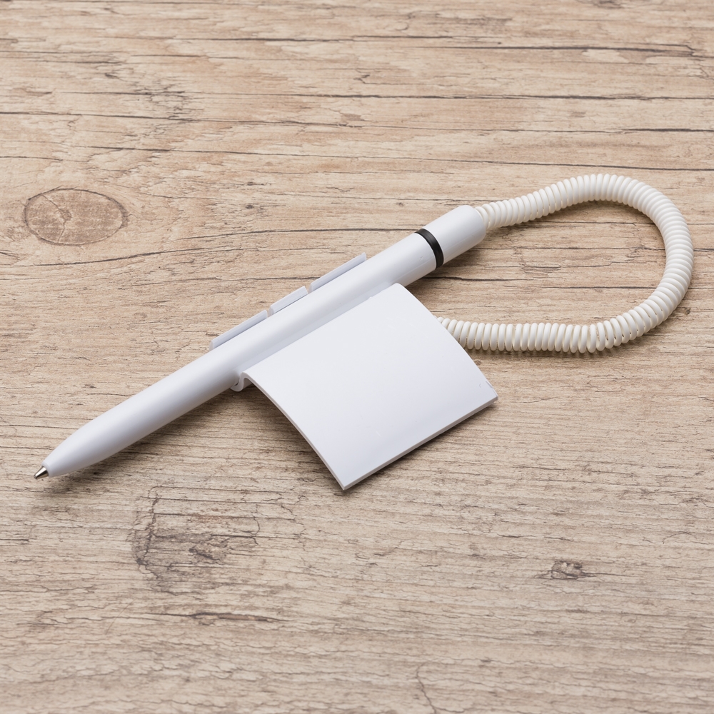 Caneta balcão plástica inteira branca com anel colorido. Possui suporte com traseira de adesivo auto-colante.