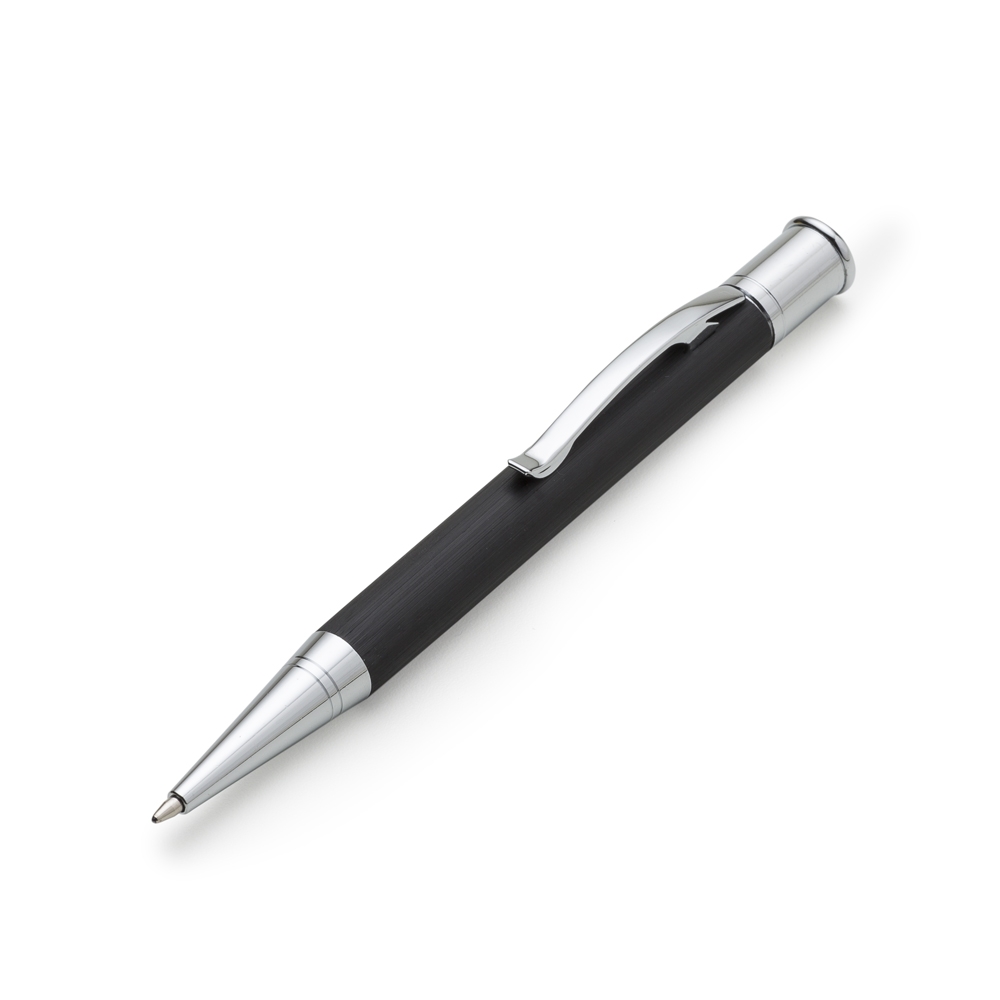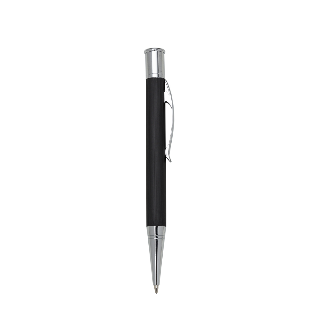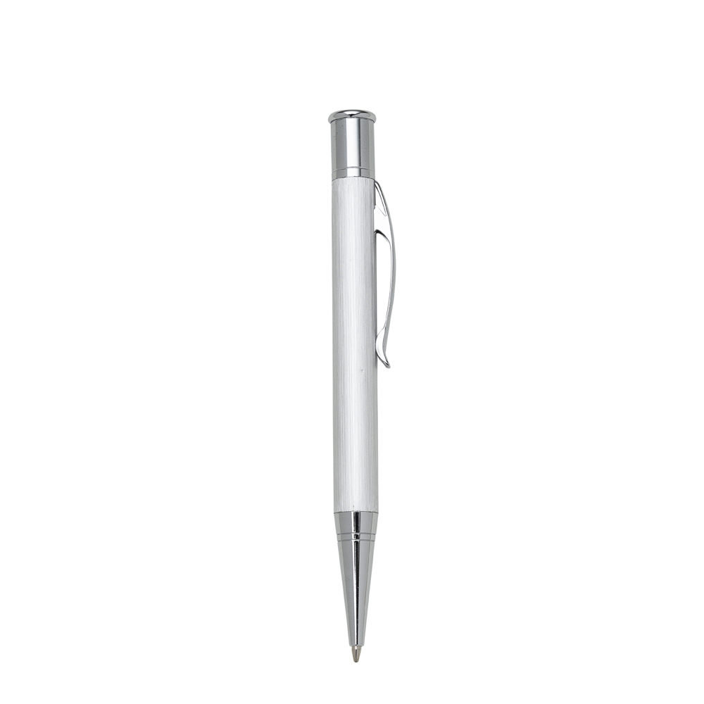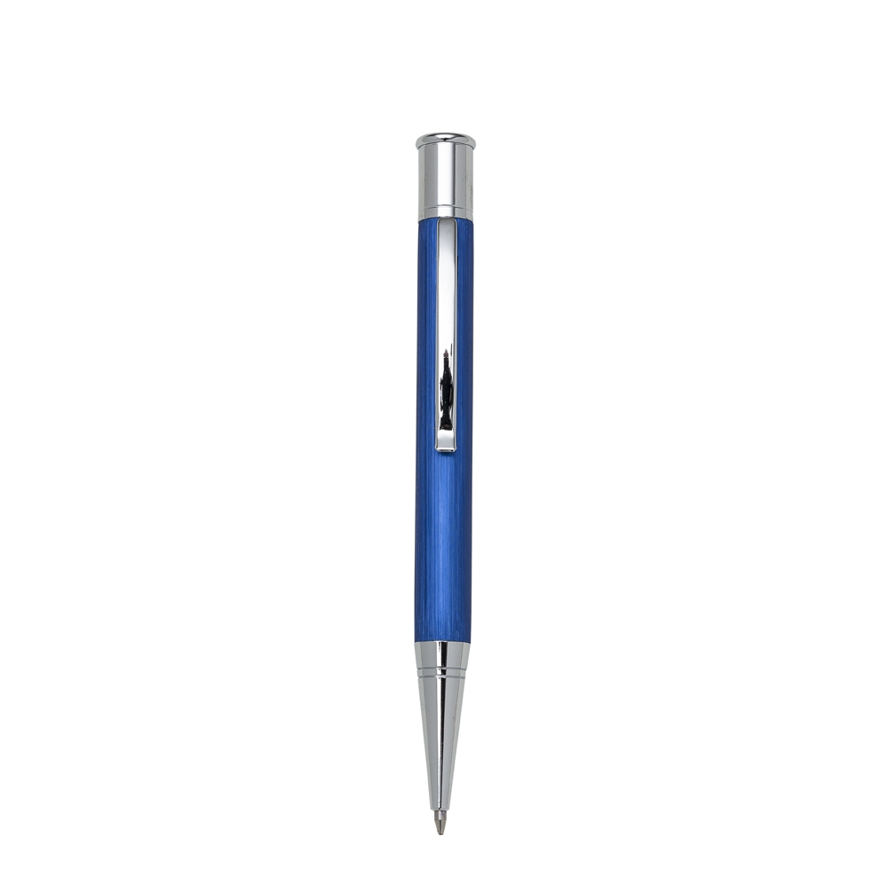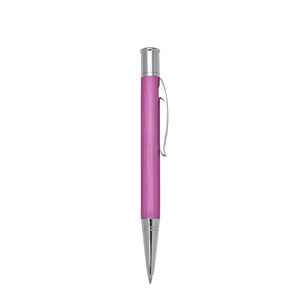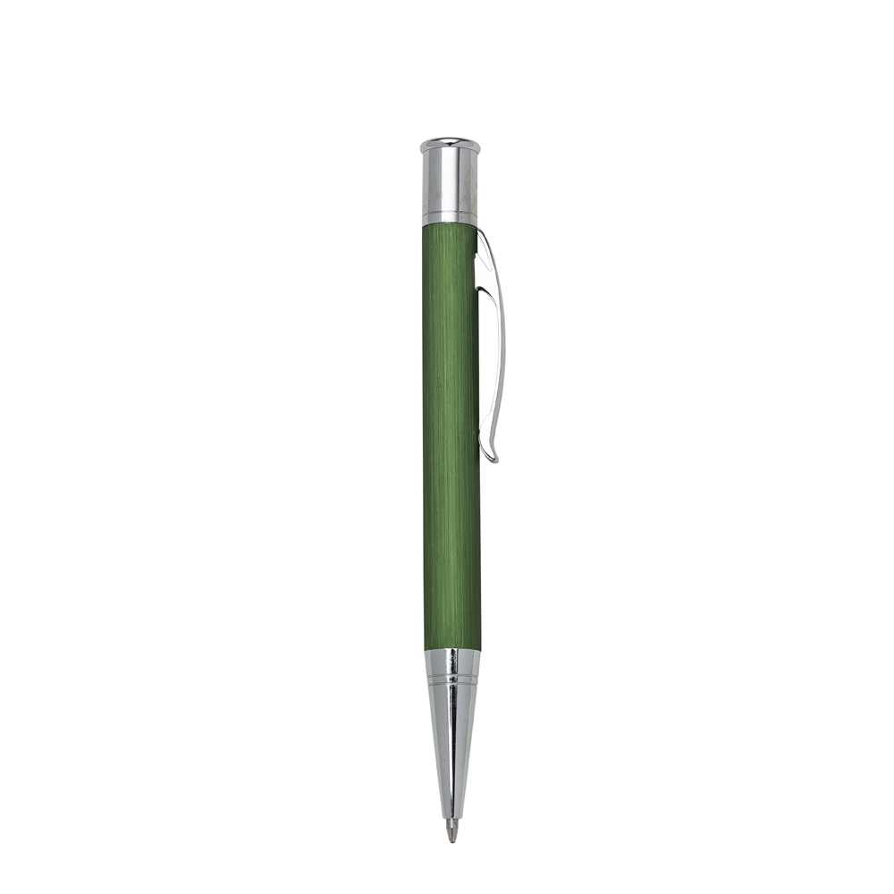 Caneta metal corpo inteiro fosco colorido com detalhes prata. Clip metal, possui um anel no acionador e dois anéis na ponteira. Aciona por giro.