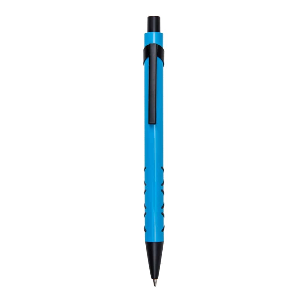 Caneta metal colorida com detalhes preto fosco. Clip metálico, parte inferior com detalhes preto emborrachado. Aciona por clique. (13255)