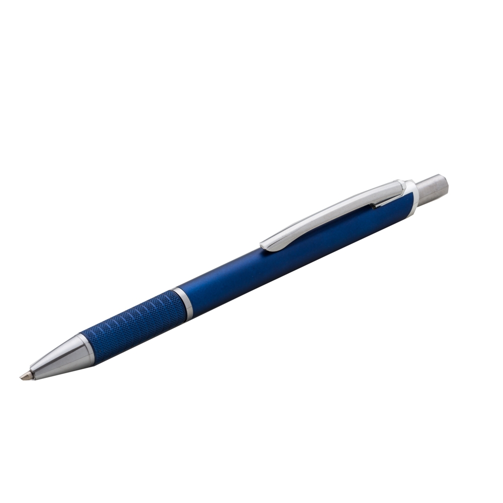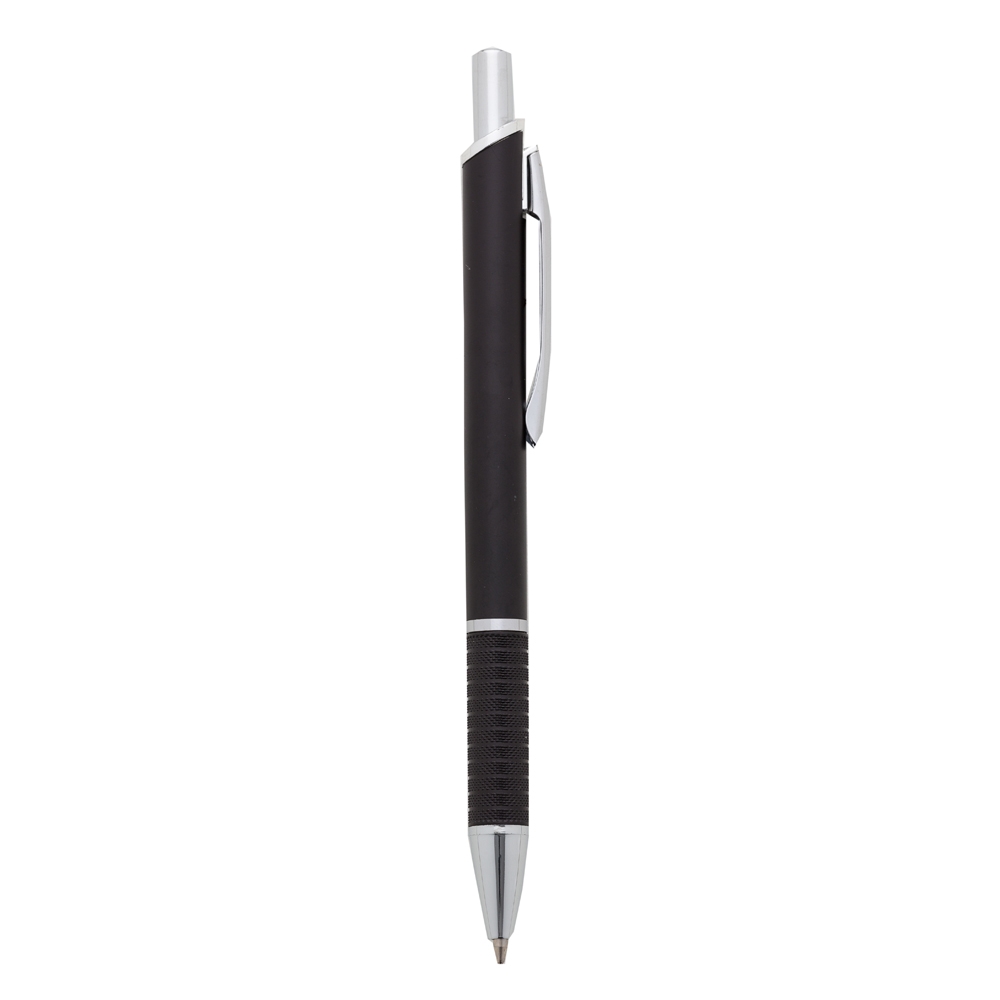 Caneta plástica fosca inteira colorida com detalhes prata. Clip de metal, anel prata e parte inferior da caneta possui detalhes com relevo, aciona por clique. Tamanho 14,9 x 1,4 cm.