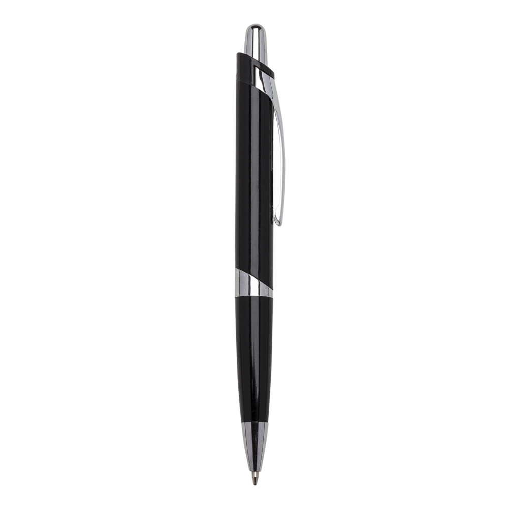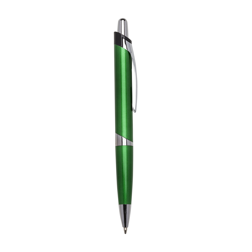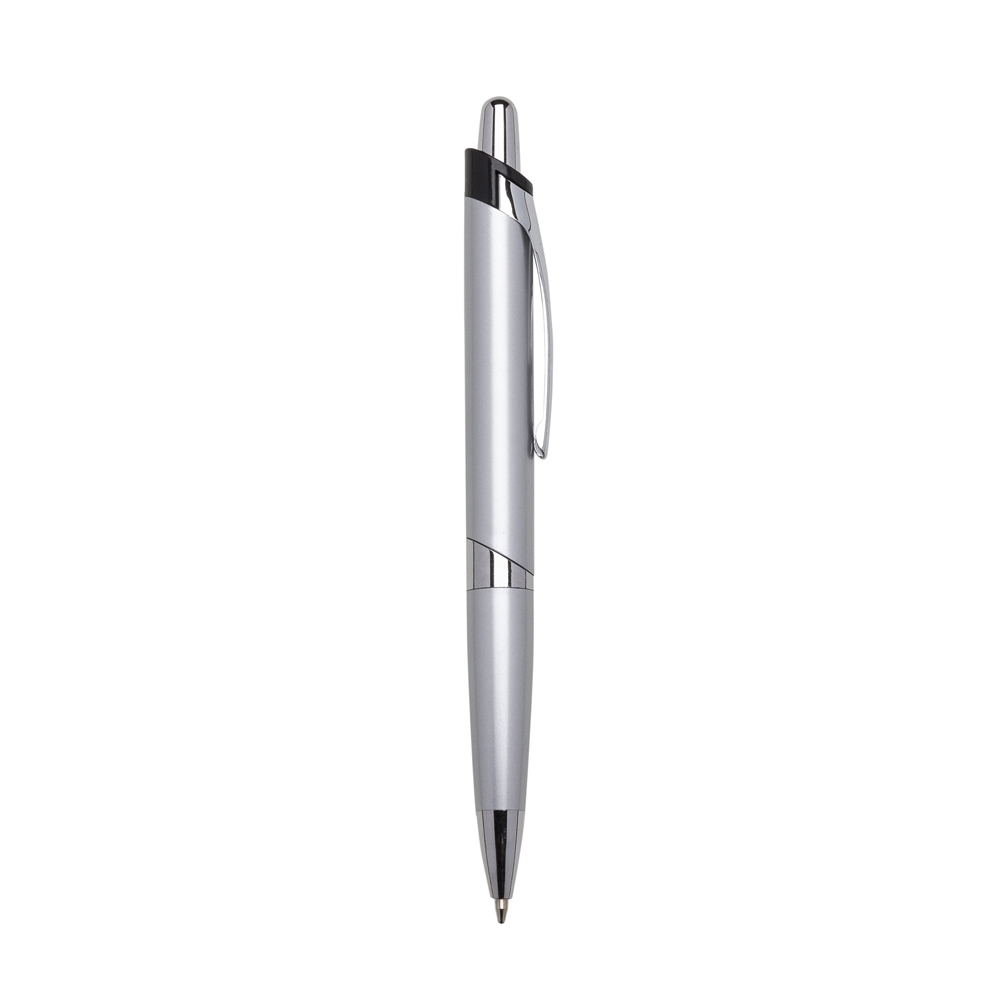 Caneta plástica inteira prata com detalhes coloridos. Possui clip de metal com um furo e um traço vazado, suporte do acionador preto e anel central prata. Aciona por clique. Tamanho 13,9 cm x 1,5 cm.