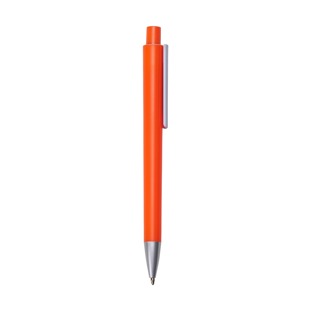 Caneta plástica colorida com clip branco. Parte superior do acionador com detalhe circular branco, ponteira prateada. Aciona por clique. Tamanho 14,1 cm x 1,4 cm