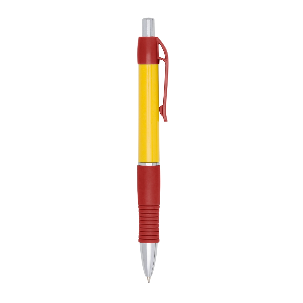 Caneta plástica amarela com detalhes coloridos. Possui clip plástico colorido, possui anel central prata e parte inferior emborrachada colorida com relevo . Aciona por clique.
