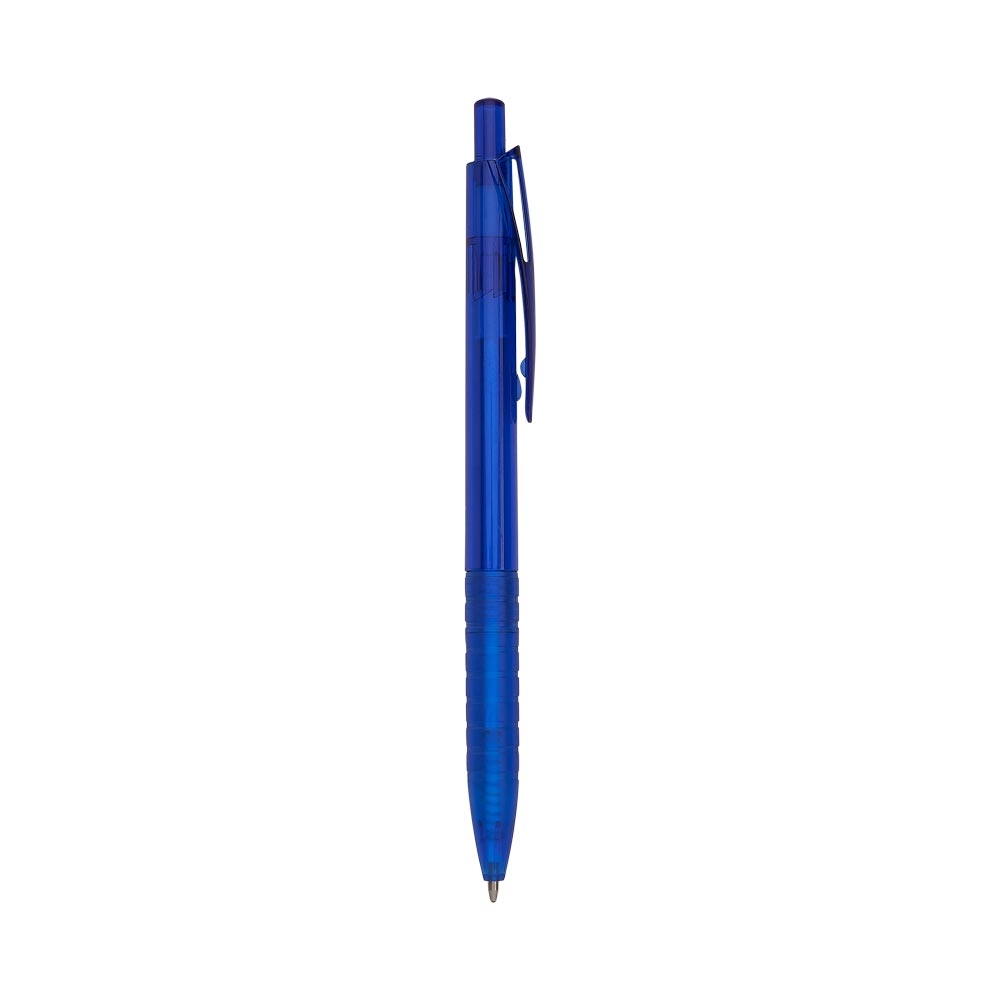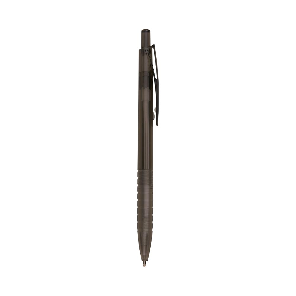 Caneta plástica translúcida inteira colorida. Clip plástico com detalhe vazado nas laterais, acionador e parte inferior preta com oito anéis em relevo. Aciona por clique. Tamanho 14,1 cm x 1,3 cm.