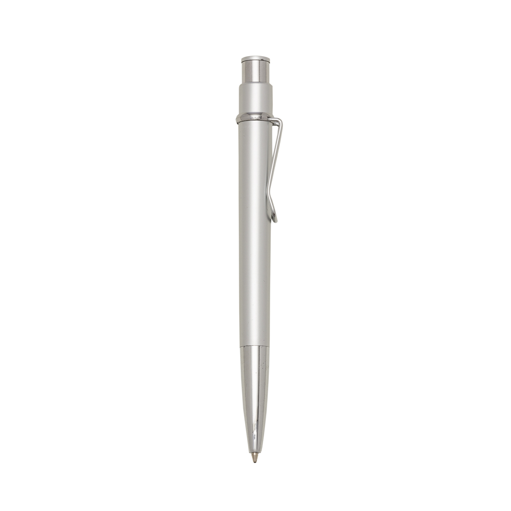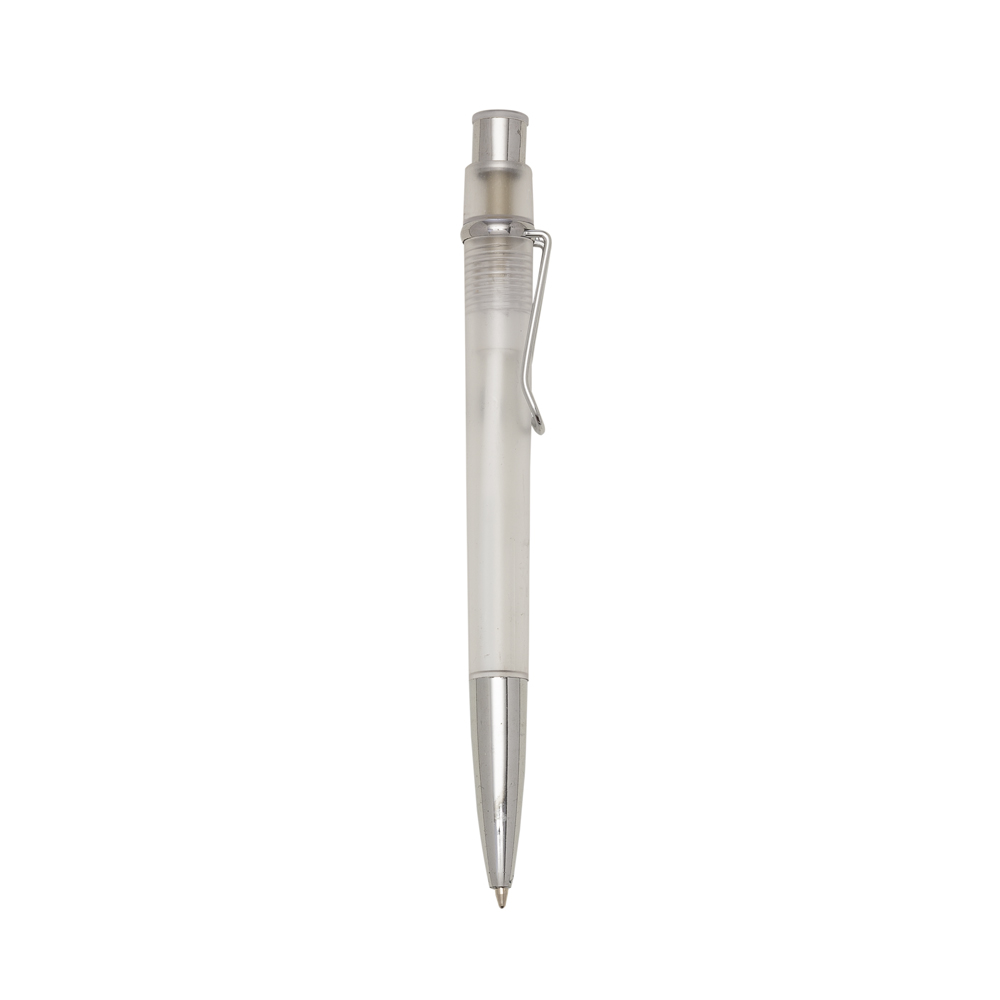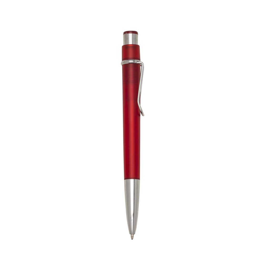 Caneta plástica inteira colorida com detalhes em prata. Clip de metal, possui anel colorido no acionador. Aciona por clique. Tamanho 14 cm x 1,7 cm.