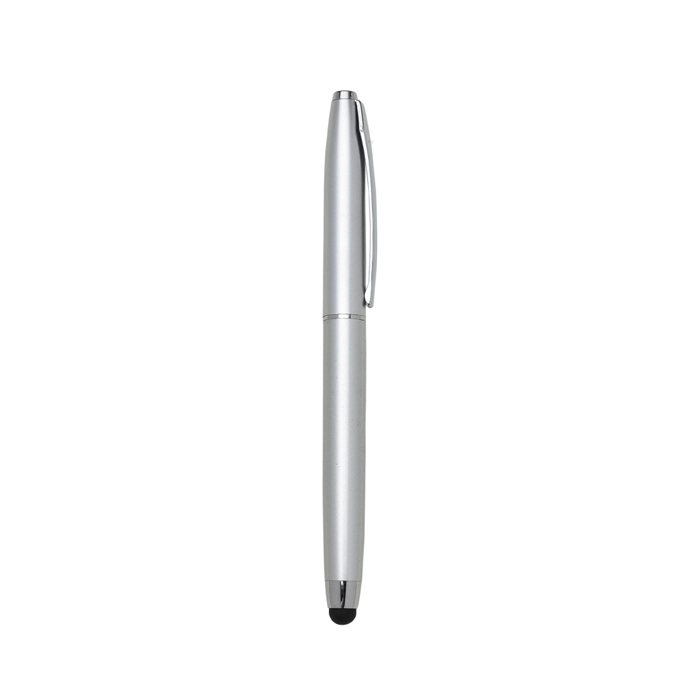 Caneta plástica touch inteira colorida com detalhes em prata. Possui tampa e clip de metal, anéis: superior, central e inferior em prata. Para utilizar esferográfica basta tirar a tampa, touch fica do lado oposto. Tamanho 13,5 cm x 1,4 cm.