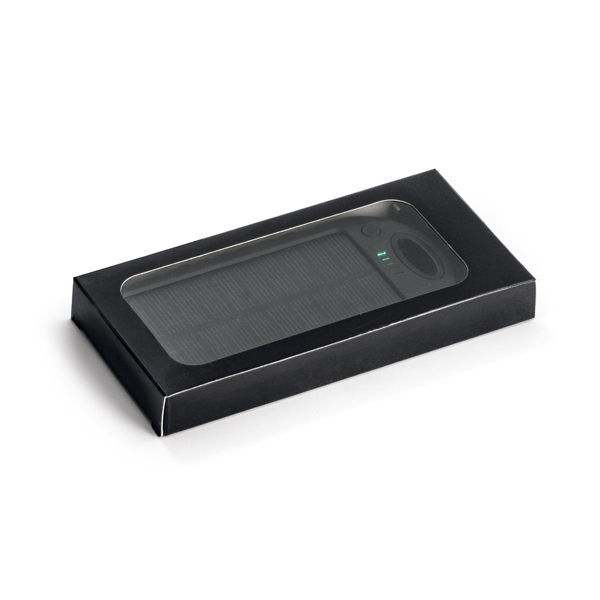 Carregador portátil solar. ABS. Com painel solar e LED. Bateria de lítio. Capacidade: 2.000 mAh. Com entrada/saída 5V/1A. Incluso cabo USB/micro-USB para carregar a bateria. 143 x 77 x 16 mm