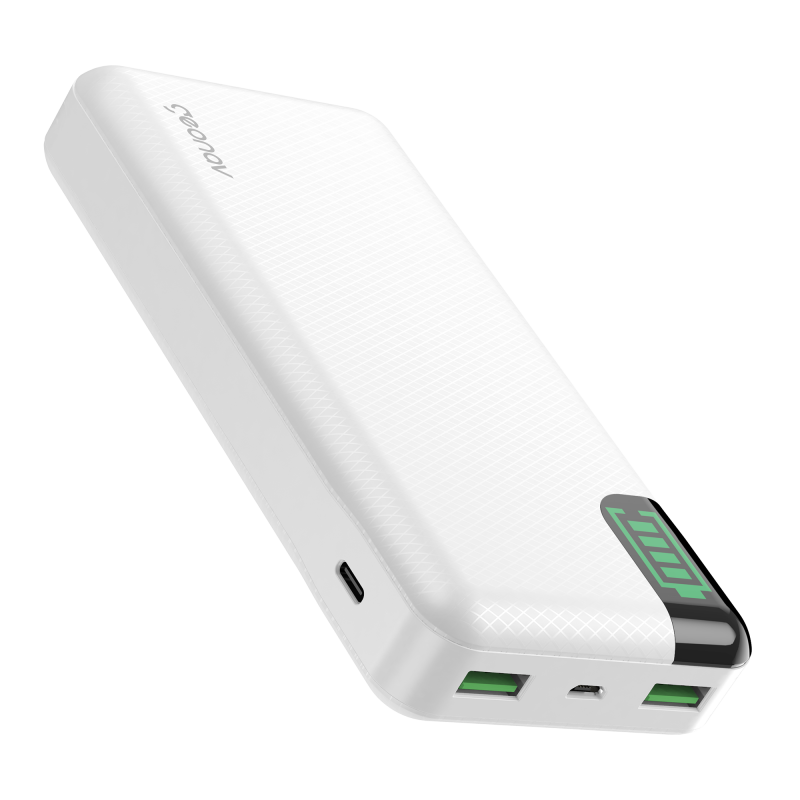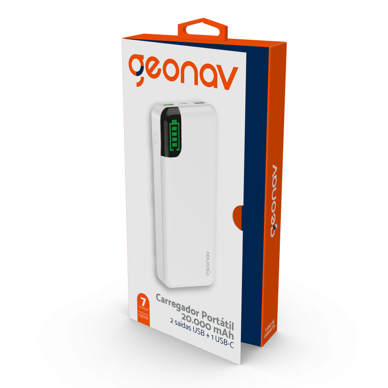 Ultra capacidade (20.000 mAh) e carregamento rápido (fast charge) com 2 portas USB QC 3.0 e 1 porta USB-C com Power Delivery (PD) de até 18W. Pode carregar até três dispositivos ao mesmo tempo.