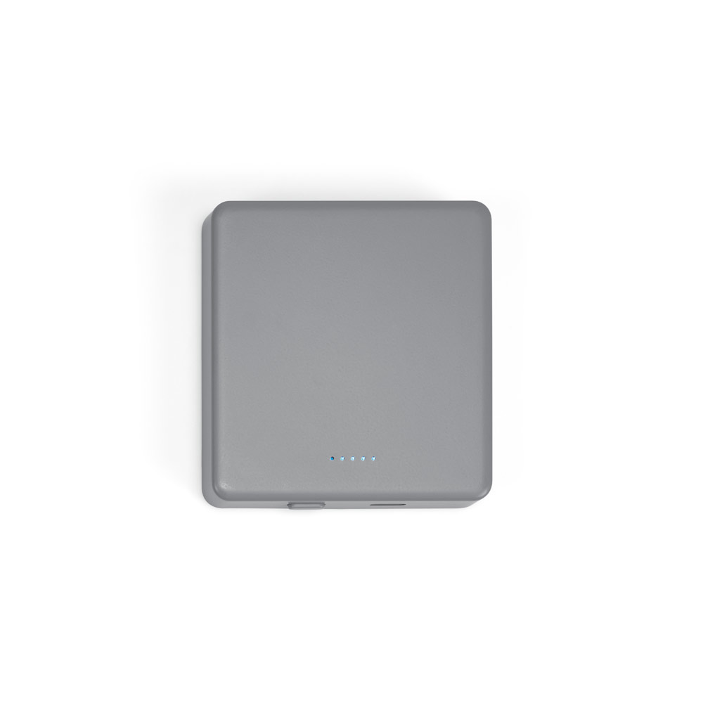Bateria portátil de carregamento rápido em ABS 100% reciclado com acabamento em mate. A bateria leve em lítio e com design slim, tem uma capacidade de 5.000 mAh e tempo de vida ≥ 300 ciclos. Esta bateria portátil torna-se muito prática para o dia a dia uma vez que permite, através do seu magnetismo, prender atrás dos smartphones ou capas com este sistema. Possui entrada/saída USB-C e potência máxima de 15W para carregamento rápido sem fios. Compatível com smartphones com tecnologia de carregamento sem fios. Incluso cabo USB-C para carregamento rápido. Fornecido em caixa presente de papel kraft. 74 x 69 x 15 mm | Caixa: 77 x 18 72 mm