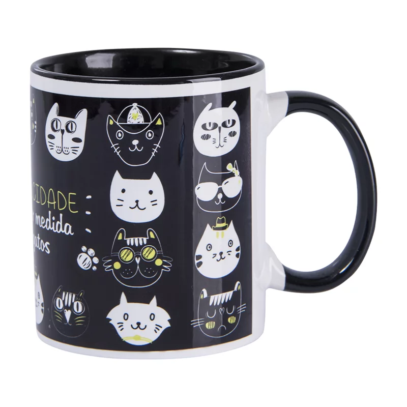 A Caneca branca em cerâmica possui interior e alça preta, criando um visual moderno. É um produto versátil, resinado e possui 3 técnicas de personalização, sendo perfeito para presentes e lembranças.
