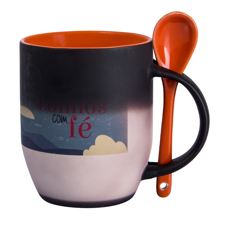 CANECA MÁGICA PARA SUBLIMAÇÃO COM INTERIOR E COLHER LARANJA